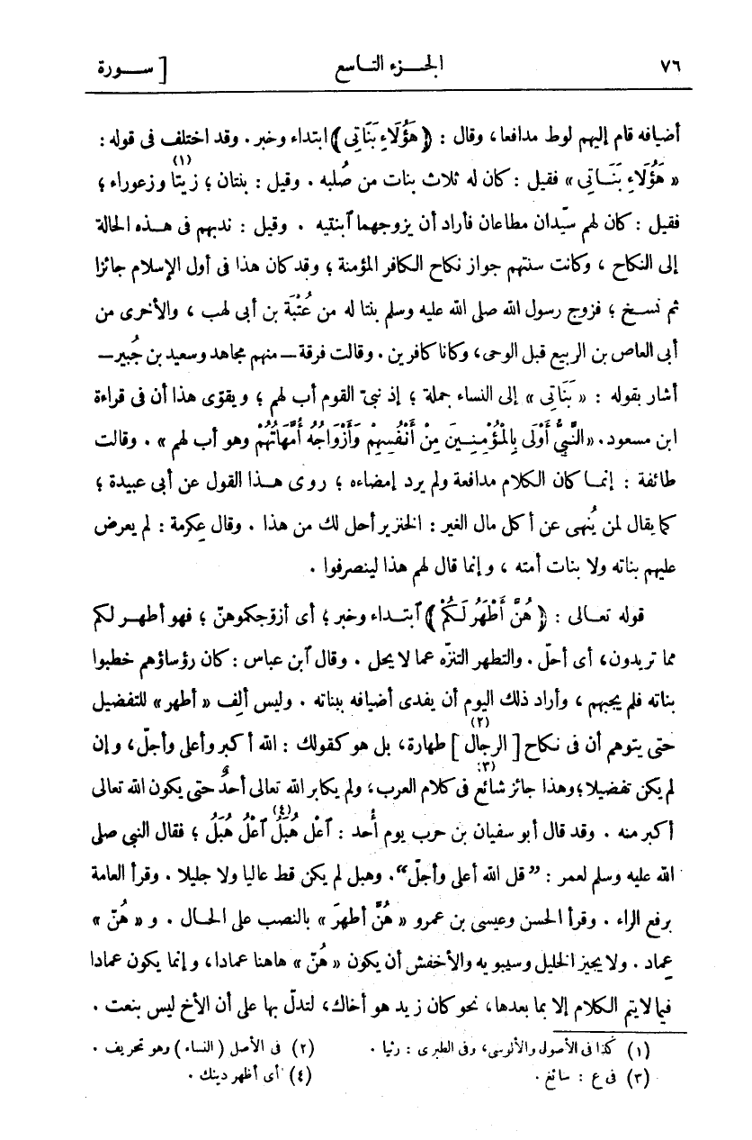 أضيافه قام إليهم لوط مدافعا، وقال: (هؤُلاءِ بَناتِي) ابْتِدَاءٌ وَخَبَرٌ. وَقَدِ اخْتُلِفَ فِي قَوْلِهِ:" هؤُلاءِ بَناتِي" فَقِيلَ: كَانَ لَهُ ثَلَاثُ بَنَاتٍ مِنْ صُلْبِهِ. وَقِيلَ: بِنْتَانِ، زَيْتَا «١» وَزَعْوَرَاءُ، فَقِيلَ: كَانَ لَهُمْ سَيِّدَانِ مُطَاعَانِ فَأَرَادَ أَنْ يُزَوِّجَهُمَا ابْنَتَيْهِ. وَقِيلَ: نَدَبَهُمْ فِي هَذِهِ الْحَالَةِ إِلَى النِّكَاحِ، وَكَانَتْ سُنَّتُهُمْ جَوَازُ نِكَاحِ الْكَافِرِ الْمُؤْمِنَةَ، وَقَدْ كَانَ هَذَا فِي أَوَّلِ الْإِسْلَامِ جَائِزًا ثُمَّ نُسِخَ، فَزَوَّجَ رَسُولُ اللَّهِ صَلَّى اللَّهُ عَلَيْهِ وَسَلَّمَ بِنْتًا لَهُ مِنْ عُتْبَةَ بْنِ أَبِي لَهَبٍ، وَالْأُخْرَى مِنْ أَبِي الْعَاصِ بْنِ الرَّبِيعِ قَبْلَ الْوَحْيِ، وَكَانَا كَافِرَيْنِ. وَقَالَتْ فِرْقَةٌ- مِنْهُمْ مُجَاهِدٌ وَسَعِيدُ بْنُ جُبَيْرٍ- أَشَارَ بِقَوْلِهِ:" بَناتِي" إِلَى النِّسَاءِ جُمْلَةً، إِذْ نَبِيُّ الْقَوْمِ أَبٌ لَهُمْ، وَيُقَوِّي هَذَا أَنَّ فِي قِرَاءَةِ ابْنِ مَسْعُودٍ." النَّبِيُّ أَوْلَى بِالْمُؤْمِنِينَ مِنْ أَنْفُسِهِمْ وَأَزْوَاجُهُ أُمَّهَاتُهُمْ وهو أب لهم [الأحزاب: ٦]. وَقَالَتْ طَائِفَةٌ: إِنَّمَا كَانَ الْكَلَامُ مُدَافَعَةً وَلَمْ يُرِدْ إِمْضَاءَهُ، رُوِيَ هَذَا الْقَوْلُ عَنْ أَبِي عُبَيْدَةَ، كَمَا يُقَالُ لِمَنْ يُنْهَى عَنْ أَكْلِ مَالِ الْغَيْرِ: الْخِنْزِيرُ أَحَلُّ لَكَ مِنْ هَذَا. وَقَالَ عِكْرِمَةُ: لَمْ يَعْرِضْ عَلَيْهِمْ بَنَاتِهِ وَلَا بَنَاتِ أُمَّتِهِ، وَإِنَّمَا قَالَ لَهُمْ هَذَا لِيَنْصَرِفُوا. قَوْلُهُ تَعَالَى: (هُنَّ أَطْهَرُ لَكُمْ) ابْتِدَاءٌ وَخَبَرٌ، أَيْ أُزَوِّجُكُمُوهُنَّ، فَهُوَ أَطْهَرُ لَكُمْ مِمَّا تُرِيدُونَ، أَيْ أَحَلُّ. وَالتَّطَهُّرُ التَّنَزُّهُ عَمَّا لَا يَحِلُّ. وَقَالَ ابْنُ عَبَّاسٍ: كَانَ رُؤَسَاؤُهُمْ خَطَبُوا بَنَاتِهِ فَلَمْ يُجِبْهُمْ، وَأَرَادَ ذَلِكَ الْيَوْمَ أَنْ يَفْدِيَ أَضْيَافَهُ بِبَنَاتِهِ. وَلَيْسَ أَلِفُ" أَطْهَرُ" لِلتَّفْضِيلِ حَتَّى يُتَوَهَّمَ أَنَّ فِي نِكَاحِ [الرِّجَالِ «٢»] طَهَارَةً، بَلْ هُوَ كَقَوْلِكَ: اللَّهُ أَكْبَرُ وَأَعْلَى وَأَجَلُّ، وَإِنْ لم يكن تفضيل، وَهَذَا جَائِزٌ شَائِعٌ «٣» فِي كَلَامِ الْعَرَبِ، وَلَمْ يُكَابِرِ اللَّهَ تَعَالَى أَحَدٌ حَتَّى يَكُونَ اللَّهُ تَعَالَى أَكْبَرَ مِنْهُ. وَقَدْ قَالَ أَبُو سُفْيَانَ بْنُ حَرْبٍ يَوْمَ أُحُدٍ: اعْلُ هُبَلُ «٤» اعْلُ هُبَلُ، فَقَالَ النَّبِيُّ صَلَّى اللَّهُ عَلَيْهِ وَسَلَّمَ لِعُمَرَ:" قُلِ اللَّهُ أَعْلَى وَأَجَلُّ". وَهُبَلُ لَمْ يَكُنْ قَطُّ عَالِيًا وَلَا جَلِيلًا. وَقَرَأَ الْعَامَّةُ بِرَفْعِ الرَّاءِ. وَقَرَأَ الْحَسَنُ وَعِيسَى بْنُ عَمْرٍو" هُنَّ أَطْهَرَ" بِالنَّصْبِ عَلَى الْحَالِ. وَ" هُنَّ" عِمَادُ. وَلَا يُجِيزُ الْخَلِيلُ وَسِيبَوَيْهِ وَالْأَخْفَشُ أَنْ يَكُونَ" هُنَّ" هَاهُنَا عِمَادًا، وَإِنَّمَا يَكُونُ عِمَادًا فِيمَا لَا يَتِمُّ الْكَلَامُ إِلَّا بِمَا بَعْدَهَا، نَحْوُ كَانَ زَيْدٌ هُوَ أَخَاكَ، لِتَدُلَّ بِهَا على أن الأخ ليس بنعت.