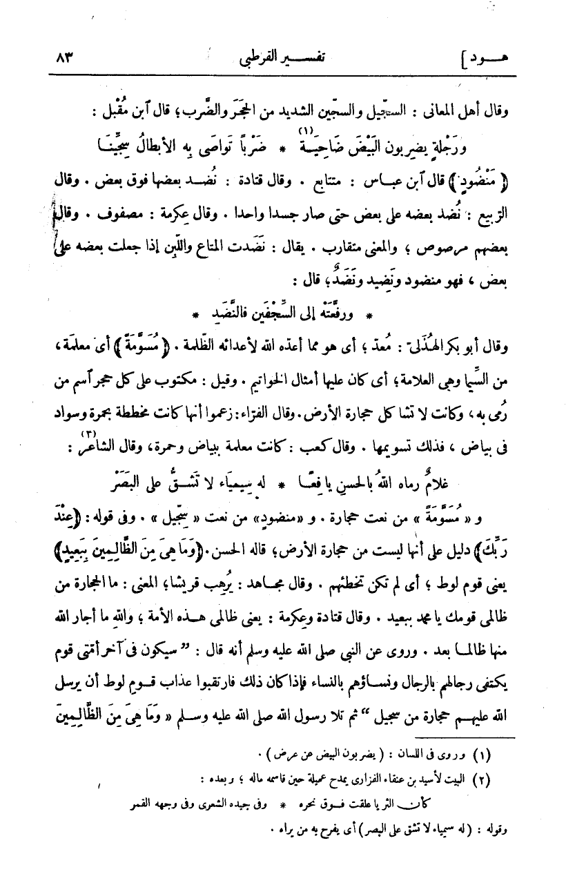وَ" مُسَوَّمَةً" مِنْ نَعْتِ حِجَارَةٍ. وَ" مَنْضُودٍ" مِنْ نَعْتِ" سِجِّيلٍ". وَفِي قَوْلِهِ: (عِنْدَ رَبِّكَ) " دَلِيلٌ عَلَى أَنَّهَا لَيْسَتْ مِنْ حِجَارَةِ الْأَرْضِ، قَالَهُ الْحَسَنُ. (وَما هِيَ مِنَ الظَّالِمِينَ بِبَعِيدٍ) يَعْنِي قَوْمَ لُوطٍ، أَيْ لَمْ تَكُنْ تُخْطِئُهُمْ. وَقَالَ مُجَاهِدٌ: يُرْهِبُ قُرَيْشًا، الْمَعْنَى: مَا الْحِجَارَةُ مِنْ ظَالِمِي قَوْمِكَ يَا مُحَمَّدُ بِبَعِيدٍ. وَقَالَ قَتَادَةُ وَعِكْرِمَةُ: يَعْنِي ظَالِمِي هَذِهِ الْأُمَّةِ، وَاللَّهِ مَا أَجَارَ اللَّهُ مِنْهَا ظَالِمًا بَعْدُ. وَرُوِيَ عَنِ النَّبِيِّ صَلَّى اللَّهُ عَلَيْهِ وَسَلَّمَ أَنَّهُ قَالَ:" سَيَكُونُ فِي آخِرِ أُمَّتِي قَوْمٌ يَكْتَفِي رِجَالُهُمْ بِالرِّجَالِ وَنِسَاؤُهُمْ بِالنِّسَاءِ فَإِذَا كَانَ ذَلِكَ فَارْتَقِبُوا عَذَابَ قَوْمِ لُوطٍ أَنْ يُرْسِلَ اللَّهُ عَلَيْهِمْ حِجَارَةً مِنْ سِجِّيلٍ" ثُمَّ تَلَا رَسُولُ اللَّهِ صَلَّى اللَّهُ عَلَيْهِ وَسَلَّمَ" وَما هِيَ مِنَ الظَّالِمِينَ بِبَعِيدٍ".