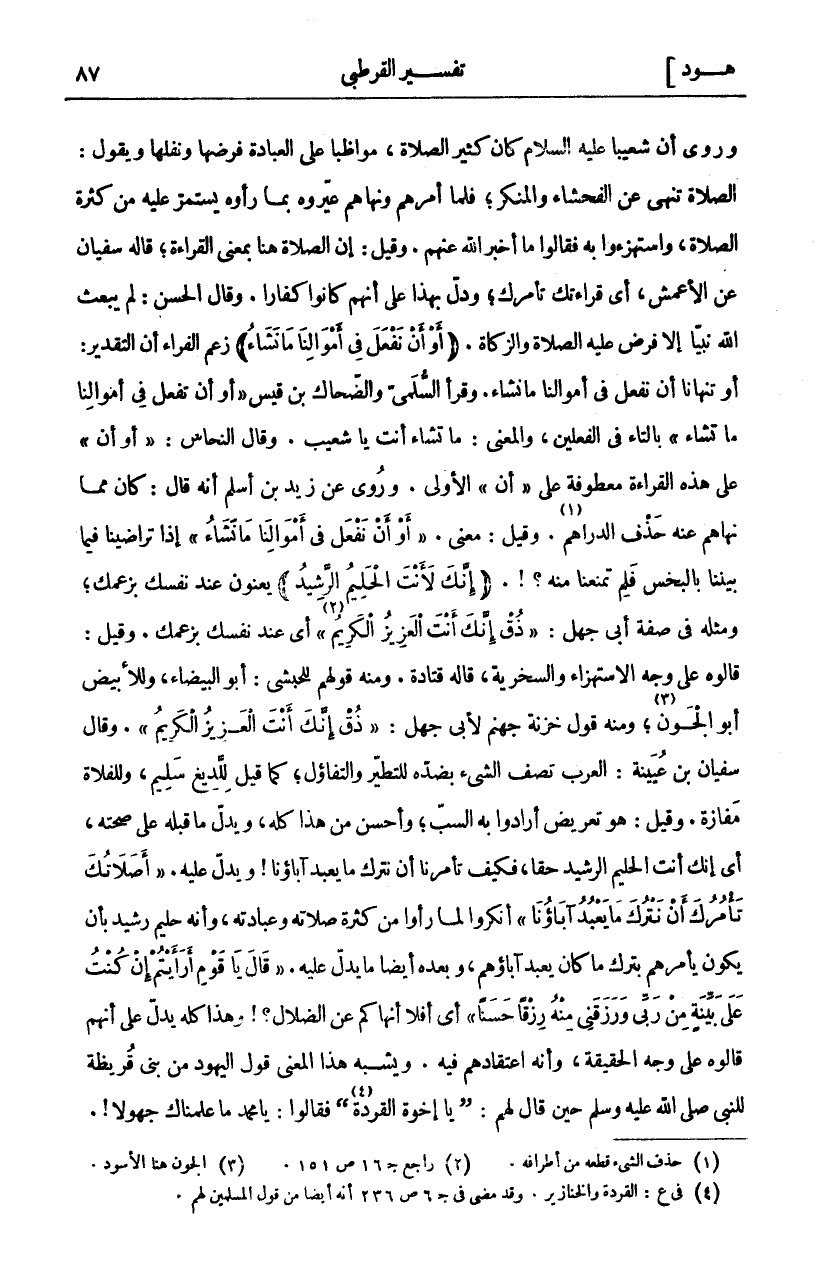 وَرُوِيَ أَنَّ شُعَيْبًا عَلَيْهِ السَّلَامُ كَانَ كَثِيرَ الصَّلَاةِ، مُوَاظِبًا عَلَى الْعِبَادَةِ فَرْضِهَا وَنَفْلِهَا وَيَقُولُ: الصَّلَاةُ تَنْهَى عَنِ الْفَحْشَاءِ وَالْمُنْكَرِ، فَلَمَّا أَمَرَهُمْ وَنَهَاهُمْ عَيَّرُوهُ بِمَا رَأَوْهُ يَسْتَمِرُّ عَلَيْهِ مِنْ كَثْرَةِ الصَّلَاةِ، وَاسْتَهْزَءُوا بِهِ فَقَالُوا مَا أَخْبَرَ اللَّهُ عَنْهُمْ. وَقِيلَ: إِنَّ الصَّلَاةَ هُنَا بِمَعْنَى الْقِرَاءَةِ، قَالَهُ سُفْيَانُ عَنِ الْأَعْمَشِ، أَيْ قِرَاءَتُكَ تَأْمُرُكَ، وَدَلَّ بِهَذَا عَلَى أَنَّهُمْ كَانُوا كُفَّارًا. وَقَالَ الْحَسَنُ: لَمْ يَبْعَثِ اللَّهُ نَبِيًّا إِلَّا فَرَضَ عَلَيْهِ الصَّلَاةَ وَالزَّكَاةَ. (أَوْ أَنْ نَفْعَلَ فِي أَمْوالِنا ما نَشؤُا) زَعَمَ الْفَرَّاءُ أَنَّ التَّقْدِيرَ: أَوْ تَنْهَانَا أَنْ نَفْعَلَ فِي أَمْوَالِنَا مَا نَشَاءُ. وَقَرَأَ السُّلَمِيُّ وَالضَّحَّاكُ بْنُ قَيْسٍ" أَوْ أَنْ تَفْعَلَ فِي أَمْوَالِنَا مَا تَشَاءُ" بِالتَّاءِ فِي الْفِعْلَيْنِ، وَالْمَعْنَى: مَا تَشَاءُ أَنْتَ يَا شُعَيْبُ. وَقَالَ النَّحَّاسُ:" أَوْ أَنْ" عَلَى هَذِهِ الْقِرَاءَةِ مَعْطُوفَةٌ عَلَى" أَنْ" الْأُولَى. وَرُوِيَ عَنْ زَيْدِ بْنِ أَسْلَمَ أَنَّهُ قَالَ: كَانَ مِمَّا نَهَاهُمْ عَنْهُ حَذْفُ الدَّرَاهِمِ «١». وَقِيلَ: مَعْنَى." أَوْ أَنْ نَفْعَلَ فِي أَمْوالِنا ما نَشؤُا" إِذَا تَرَاضَيْنَا فِيمَا بَيْنَنَا بِالْبَخْسِ فَلِمَ تَمْنَعَنَا مِنْهُ؟!. (إِنَّكَ لَأَنْتَ الْحَلِيمُ الرَّشِيدُ) يَعْنُونَ عِنْدَ نَفْسِكَ بِزَعْمِكَ. وَمِثْلُهُ فِي صِفَةِ أَبِي جَهْلٍ:" ذُقْ إِنَّكَ أَنْتَ الْعَزِيزُ الْكَرِيمُ" «٢» [الدخان: ٤٩] أَيْ عِنْدَ نَفْسِكَ بِزَعْمِكَ. وَقِيلَ: قَالُوهُ عَلَى وجه الاستهزاء والسخرية، قال قَتَادَةُ. وَمِنْهُ قَوْلُهُمْ لِلْحَبَشِيِّ: أَبُو الْبَيْضَاءِ، وَلِلْأَبْيَضِ أَبُو الْجَوْنِ «٣»، وَمِنْهُ قَوْلُ خَزَنَةِ جَهَنَّمَ لِأَبِي جَهْلٍ:" ذُقْ إِنَّكَ أَنْتَ الْعَزِيزُ الْكَرِيمُ". وَقَالَ سُفْيَانُ بْنُ عُيَيْنَةَ: الْعَرَبُ تَصِفُ الشَّيْءَ بِضِدِّهِ لِلتَّطَيُّرِ وَالتَّفَاؤُلِ، كَمَا قِيلَ لِلَّدِيغِ سَلِيمٌ، وَلِلْفَلَاةِ مَفَازَةٌ. وَقِيلَ: هُوَ تَعْرِيضٌ أَرَادُوا بِهِ السَّبَّ، وَأَحْسَنُ مِنْ هَذَا كُلِّهِ، وَيَدُلُّ مَا قَبْلَهُ عَلَى صِحَّتِهِ، أَيْ إِنَّكَ أَنْتَ الْحَلِيمُ الرَّشِيدُ حَقًّا، فَكَيْفَ تَأْمُرُنَا أَنْ نَتْرُكَ مَا يَعْبُدُ آبَاؤُنَا! وَيَدُلُّ عَلَيْهِ." أَصَلاتُكَ تَأْمُرُكَ أَنْ نَتْرُكَ مَا يَعْبُدُ آباؤُنا