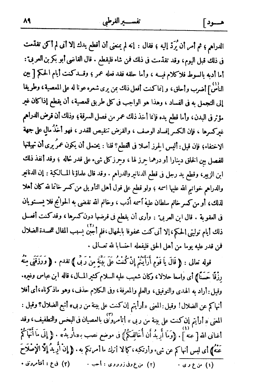 الدَّرَاهِمَ، ثُمَّ أُمِرَ أَنْ يُرَدَّ إِلَيْهِ، فَقَالَ: إِنَّهُ لَمْ يَمْنَعْنِي أَنْ أَقْطَعَ يَدَكَ إِلَّا أَنِّي لَمْ أَكُنْ تَقَدَّمْتُ فِي ذَلِكَ قَبْلَ الْيَوْمِ، وَقَدْ تَقَدَّمْتُ فِي ذَلِكَ فَمَنْ شَاءَ فَلْيَقْطَعْ. قَالَ الْقَاضِي أَبُو بَكْرِ بْنُ الْعَرَبِيِّ: أَمَّا أَدَبُهُ بِالسَّوْطِ فَلَا كَلَامَ فِيهِ، وَأَمَّا حَلْقُهُ فَقَدْ فَعَلَهُ عُمَرُ، وَقَدْ كُنْتُ أَيَّامَ الْحُكْمِ [بَيْنَ النَّاسِ] «١» أَضْرِبُ وَأَحْلِقُ، وَإِنَّمَا كُنْتُ أَفْعَلُ ذَلِكَ بِمَنْ يَرَى شَعْرَهُ عَوْنًا لَهُ عَلَى الْمَعْصِيَةِ، وَطَرِيقًا إِلَى التَّجَمُّلِ بِهِ فِي الْفَسَادِ، وَهَذَا هُوَ الْوَاجِبُ فِي كُلِّ طَرِيقٍ لِلْمَعْصِيَةِ، أَنْ يُقْطَعَ إِذَا كَانَ غَيْرَ مُؤَثِّرٍ فِي الْبَدَنِ، وَأَمَّا قَطْعُ يَدِهِ فَإِنَّمَا أَخَذَ ذَلِكَ عُمَرُ مِنْ فَصْلِ السَّرِقَةِ، وَذَلِكَ أَنَّ قَرْضَ الدَّرَاهِمِ غَيْرُ كَسْرِهَا، فَإِنَّ الْكَسْرَ إِفْسَادُ الْوَصْفِ، وَالْقَرْضَ تَنْقِيصٌ لِلْقَدْرِ، فَهُوَ أَخْذُ مَالٍ عَلَى جِهَةِ الِاخْتِفَاءِ، فَإِنْ قِيلَ: أَلَيْسَ الْحِرْزُ أَصْلًا فِي الْقَطْعِ؟ قُلْنَا: يَحْتَمِلُ أَنْ يَكُونَ عُمَرُ يَرَى أَنَّ تَهْيِئَتَهَا لِلْفَصْلِ بَيْنَ الْخَلْقِ دِينَارًا أَوْ دِرْهَمًا حِرْزٌ لَهَا، وَحِرْزُ كُلِّ شي عَلَى قَدْرِ حَالِهِ، وَقَدْ أَنْفَذَ ذَلِكَ ابْنُ الزُّبَيْرِ، وَقَطَعَ يَدَ رَجُلٍ فِي قَطْعِ الدَّنَانِيرِ وَالدَّرَاهِمِ. وَقَدْ قَالَ عُلَمَاؤُنَا الْمَالِكِيَّةُ: إِنَّ الدَّنَانِيرَ وَالدَّرَاهِمَ خَوَاتِيمُ اللَّهِ عَلَيْهَا اسْمُهُ، وَلَوْ قُطِعَ عَلَى قَوْلِ أَهْلِ التَّأْوِيلِ مَنْ كَسَرَ خَاتَمًا لِلَّهِ كَانَ أَهْلًا لِذَلِكَ، أَوْ مَنْ كَسَرَ خَاتَمَ سُلْطَانٍ عَلَيْهِ اسْمُهُ أُدِّبَ، وَخَاتَمُ اللَّهِ تُقْضَى بِهِ الْحَوَائِجُ فَلَا يَسْتَوِيَانِ فِي الْعُقُوبَةِ. قَالَ ابْنُ الْعَرَبِيِّ: وَأَرَى أَنْ يُقْطَعَ فِي قَرْضِهَا دُونَ كَسْرِهَا، وَقَدْ كُنْتُ أَفْعَلُ ذَلِكَ أَيَّامَ تَوْلِيَتِي الْحُكْمَ، إِلَّا أَنِّي كُنْتُ مَحْفُوفًا بِالْجُهَّالِ، فَلَمْ أَجْبُنْ «٢» بِسَبَبِ الْمَقَالِ لِلْحَسَدَةِ الضُّلَّالِ فَمَنْ قَدَرَ عَلَيْهِ يَوْمًا مِنْ أَهْلِ الْحَقِّ فَلْيَفْعَلْهُ احْتِسَابًا لِلَّهِ تَعَالَى. قَوْلُهُ تَعَالَى: (قالَ يَا قَوْمِ أَرَأَيْتُمْ إِنْ كُنْتُ عَلى بَيِّنَةٍ مِنْ رَبِّي) تقدم (وَرَزَقَنِي مِنْهُ رِزْقاً حَسَناً) أَيْ وَاسِعًا حَلَالًا، وَكَانَ شُعَيْبٌ عَلَيْهِ السَّلَامُ كَثِيرَ الْمَالِ، قَالَهُ ابْنُ عَبَّاسٍ وَغَيْرُهُ. وَقِيلَ: أَرَادَ بِهِ. الْهُدَى وَالتَّوْفِيقَ، وَالْعِلْمَ وَالْمَعْرِفَةَ، وَفِي الْكَلَامِ حَذْفٌ، وَهُوَ مَا ذَكَرْنَاهُ، أَيْ أَفَلَا أَنْهَاكُمْ عَنِ الضَّلَالِ! وَقِيلَ: الْمَعْنَى" أَرَأَيْتُمْ إِنْ كُنْتُ عَلى بَيِّنَةٍ مِنْ رَبِّي" أَتَّبِعُ الضُّلَّالَ؟ وَقِيلَ: الْمَعْنَى" أَرَأَيْتُمْ إِنْ كُنْتُ عَلى بَيِّنَةٍ مِنْ رَبِّي" أَتَأْمُرُونَنِي «٣» بِالْعِصْيَانِ فِي الْبَخْسِ وَالتَّطْفِيفِ، وَقَدْ أَغْنَانِي اللَّهُ [عَنْهُ] «٤». (وَما أُرِيدُ أَنْ أُخالِفَكُمْ) فِي مَوْضِعِ نَصْبٍ بِ" أُرِيدُ". (إِلى مَا أَنْهاكُمْ عَنْهُ) أَيْ لَيْسَ أَنْهَاكُمْ عَنْ شي وَأَرْتَكِبُهُ كَمَا لَا أَتْرُكُ مَا أَمَرْتُكُمْ بِهِ. (إِنْ أُرِيدُ إِلَّا الْإِصْلاحَ مَا اسْتَطَعْتُ)