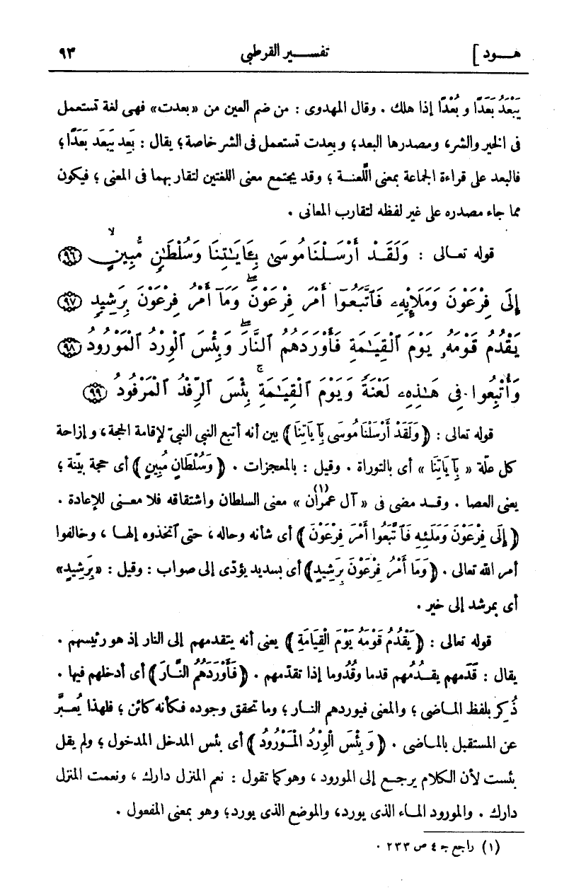 وَلَقَدْ أَرْسَلْنا مُوسى بِآياتِنا وَسُلْطانٍ مُبِينٍ (٩٦) إِلى فِرْعَوْنَ وَمَلائِهِ فَاتَّبَعُوا أَمْرَ فِرْعَوْنَ وَما أَمْرُ فِرْعَوْنَ بِرَشِيدٍ (٩٧) يَقْدُمُ قَوْمَهُ يَوْمَ الْقِيامَةِ فَأَوْرَدَهُمُ النَّارَ وَبِئْسَ الْوِرْدُ الْمَوْرُودُ (٩٨) وَأُتْبِعُوا فِي هذِهِ لَعْنَةً وَيَوْمَ الْقِيامَةِ بِئْسَ الرِّفْدُ الْمَرْفُودُ (٩٩)