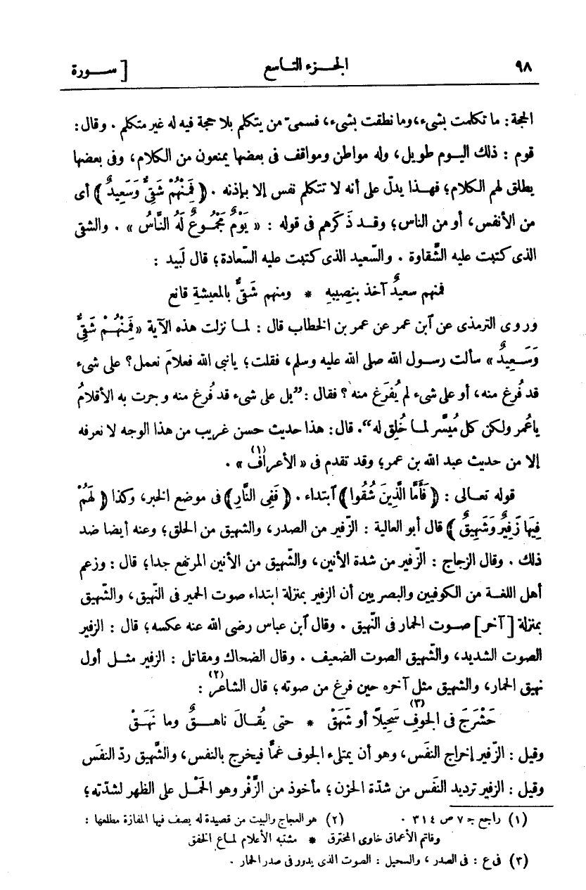 الْحُجَّةِ: مَا تَكَلَّمْتَ بِشَيْءٍ، وَمَا نَطَقْتَ بِشَيْءٍ، فَسُمِّيَ مَنْ يَتَكَلَّمُ بِلَا حُجَّةٍ فِيهِ لَهُ غَيْرَ مُتَكَلِّمٍ. وَقَالَ: قَوْمٌ: ذَلِكَ الْيَوْمُ طَوِيلٌ، وَلَهُ مَوَاطِنُ وَمَوَاقِفُ فِي بَعْضِهَا يُمْنَعُونَ مِنَ الْكَلَامِ، وَفِي بَعْضِهَا يُطْلَقُ لَهُمُ الْكَلَامُ، فَهَذَا يَدُلُّ عَلَى أَنَّهُ لَا تَتَكَلَّمُ نَفْسٌ إِلَّا بِإِذْنِهِ. (فَمِنْهُمْ شَقِيٌّ وَسَعِيدٌ) أَيْ مِنَ الْأَنْفُسِ، أو من الناس، وقد ذكرهم قَوْلِهِ:" يَوْمٌ مَجْمُوعٌ لَهُ النَّاسُ". وَالشَّقِيُّ الَّذِي كُتِبَتْ عَلَيْهِ الشَّقَاوَةُ. وَالسَّعِيدُ الَّذِي كُتِبَتْ عَلَيْهِ السَّعَادَةُ، قَالَ لَبِيَدٌ: