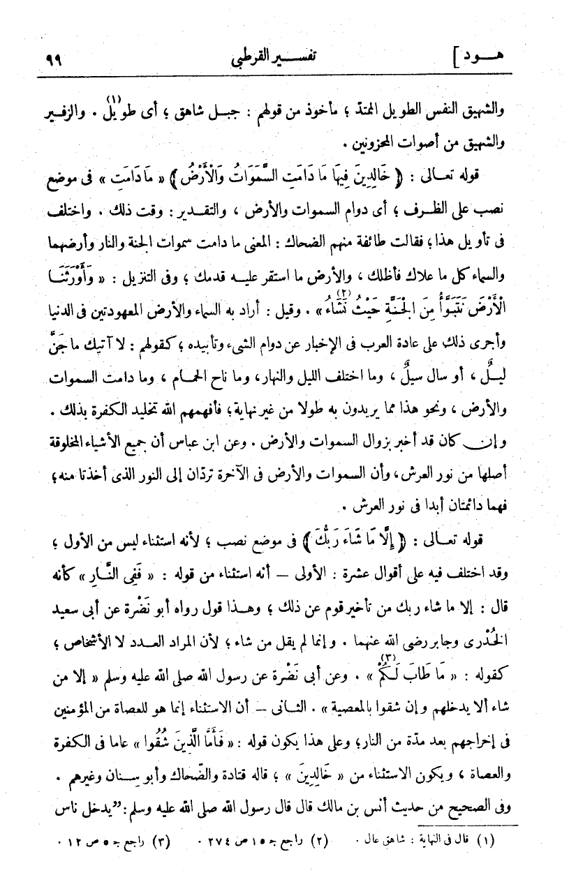 " «٢» [الزمر: ٧٤]. وَقِيلَ: أَرَادَ بِهِ السَّمَاءَ وَالْأَرْضَ الْمَعْهُودَتَيْنِ فِي الدُّنْيَا وَأَجْرَى ذَلِكَ عَلَى عَادَةِ الْعَرَبِ فِي الْإِخْبَارِ. عَنْ دَوَامِ الشَّيْءِ وَتَأْبِيدِهِ، كَقَوْلِهِمْ: لَا آتِيكَ مَا جَنَّ لَيْلٌ، أَوْ سَالَ سَيْلٌ، وَمَا اخْتَلَفَ اللَّيْلُ وَالنَّهَارُ، وَمَا نَاحَ الْحَمَامُ، وما دامت السموات وَالْأَرْضُ، وَنَحْوُ هَذَا مِمَّا يُرِيدُونَ بِهِ طُولًا مِنْ غَيْرِ نِهَايَةٍ، فَأَفْهَمَهُمُ اللَّهُ تَخْلِيدَ الْكَفَرَةِ بذلك. وإن كان قد أخبر بزوال السموات وَالْأَرْضِ. وَعَنِ ابْنِ عَبَّاسٍ أَنَّ جَمِيعَ الْأَشْيَاءِ المخلوقة أصلها من نور العرش، وأن السموات وَالْأَرْضَ فِي الْآخِرَةِ تُرَدَّانِ إِلَى النُّورِ الَّذِي أُخِذَتَا مِنْهُ، فَهُمَا دَائِمَتَانِ أَبَدًا فِي نُورِ الْعَرْشِ. قَوْلُهُ تَعَالَى: (إِلَّا مَا شاءَ رَبُّكَ) فِي مَوْضِعِ نَصْبٍ، لِأَنَّهُ اسْتِثْنَاءٌ لَيْسَ مِنَ الْأَوَّلِ، وَقَدِ اخْتُلِفَ فِيهِ عَلَى أَقْوَالٍ عَشَرَةٍ: الْأُولَى- أَنَّهُ اسْتِثْنَاءٌ مِنْ قَوْلِهِ:" فَفِي النَّارِ" كَأَنَّهُ قَالَ: إِلَّا مَا شَاءَ رَبُّكَ مِنْ تَأْخِيرِ قَوْمٍ عَنْ ذَلِكَ، وَهَذَا قَوْلٌ رَوَاهُ أَبُو نَضْرَةَ عَنْ أَبِي سَعِيدٍ الْخُدْرِيِّ وَجَابِرٍ رَضِيَ اللَّهُ عَنْهُمَا. وَإِنَّمَا لَمْ يَقُلْ مَنْ شَاءَ، لِأَنَّ الْمُرَادَ الْعَدَدُ لَا الْأَشْخَاصُ، كَقَوْلِهِ:" ما طابَ لَكُمْ" «٣» [النساء: ٣]. وَعَنْ أَبِي نَضْرَةَ عَنْ رَسُولِ اللَّهِ صَلَّى اللَّهُ عَلَيْهِ وَسَلَّمَ" إِلَّا مَنْ شَاءَ أَلَّا يُدْخِلَهُمْ وَإِنْ شَقُوا بِالْمَعْصِيَةِ". الثَّانِي- أَنَّ الِاسْتِثْنَاءَ إِنَّمَا هُوَ لِلْعُصَاةِ مِنَ الْمُؤْمِنِينَ فِي إِخْرَاجِهِمْ بَعْدَ مُدَّةٍ مِنَ النَّارِ، وَعَلَى هَذَا يَكُونُ قَوْلُهُ:" فَأَمَّا الَّذِينَ شَقُوا" عَامًّا فِي الْكَفَرَةِ وَالْعُصَاةِ، وَيَكُونُ الِاسْتِثْنَاءُ مِنْ" خالِدِينَ"، قَالَهُ قَتَادَةُ وَالضَّحَّاكُ وَأَبُو سِنَانٍ وَغَيْرُهُمْ. وَفِي الصَّحِيحِ مِنْ حَدِيثِ أَنَسِ بْنِ مَالِكٍ قَالَ: قَالَ رَسُولُ اللَّهِ صَلَّى اللَّهُ عَلَيْهِ وَسَلَّمَ:" يَدْخُلُ نَاسٌ