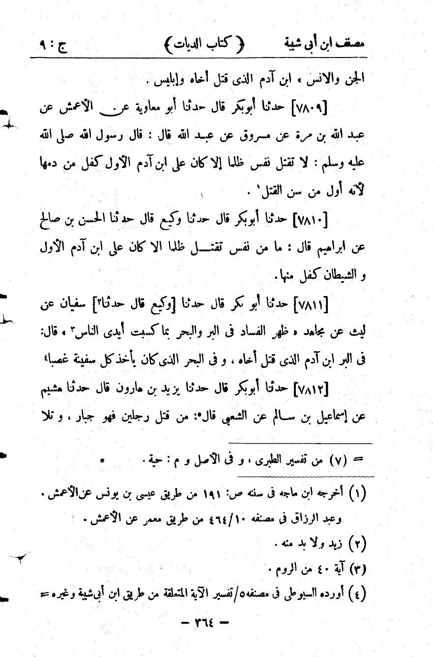 28335- حَدَّثَنَا وَكِيعٌ ، قَالَ : حدَّثَنَا الْحَسَنُ بْنُ صَالِحٍ ، عَنْ إِبْرَاهِيمَ بْنِ الْمُهَاجِرِ ، عَنْ إِبْرَاهِيمَ ، قَالَ : مَا مِنْ نَفْسٍ تُقْتَلُ ظُلْمًا ، إِلاَّ كَانَ عَلَى ابْنِ آدَمَ الأَوَّلِ وَالشَّيْطَانِ كِفْلٌ مِنْهَا.