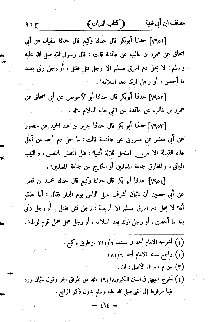 28483- حَدَّثَنَا جَرِيرُ بْنُ عَبْدِ الْحَمِيدِ ، عَن مَنْصُورٍ ، عَنْ إِبْرَاهِيمَ ، عَنْ أَبِي مَعْشَرٍ ، عَن مَسْرُوقٍ ، عَنْ عَائِشَةَ ، قَالَتْ : مَا حَلَّ دَمُ أَحَدٍ مِنْ أَهْلِ هَذِهِ الْقِبْلَةِ ، إِلاَّ مَنِ اسْتَحَلَّ ثَلاَثَةَ أَشْيَاءَ ؛ قَتْلَ النَّفْسِ بِالنَّفْسِ ، وَالثَّيِّبَ الزَّانِي ، وَالْمُفَارِقَ جَمَاعَةَ الْمُسْلِمِينَ ، أَوِ الْخَارِجَ مِنْ جَمَاعَةِ الْمُسْلِمِينَ.