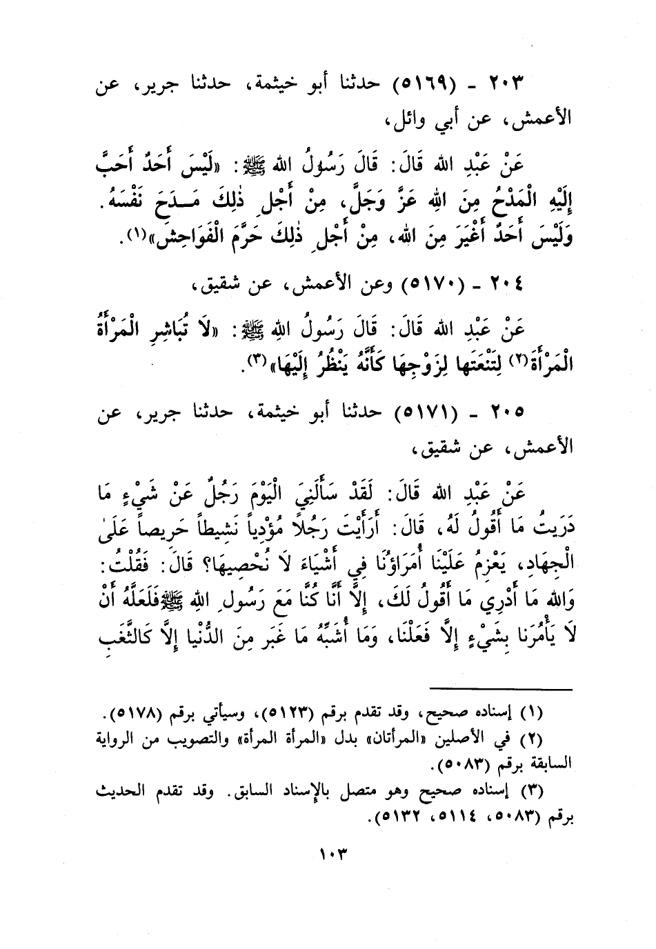 5169 - حَدَّثَنَا أَبُو خَيْثَمَةَ، حَدَّثَنَا جَرِيرٌ، عَنِ الْأَعْمَشِ، عَنْ أَبِي وَائِلٍ، عَنْ عَبْدِ اللَّهِ قَالَ: قَالَ رَسُولُ اللَّهِ صَلَّى اللهُ عَلَيْهِ وَسَلَّمَ: «§لَيْسَ أَحَدٌ أَحَبَّ إِلَيْهِ الْمَدْحُ مِنَ اللَّهِ عَزَّ وَجَلَّ، مِنْ أَجْلِ ذَلِكَ مَدَحَ نَفْسَهُ، وَلَيْسَ أَحَدٌ أَغْيَرَ مِنَ اللَّهِ، مِنْ أَجْلِ ذَلِكَ حَرَّمَ الْفَوَاحِشَ» Kإسناده صحيح