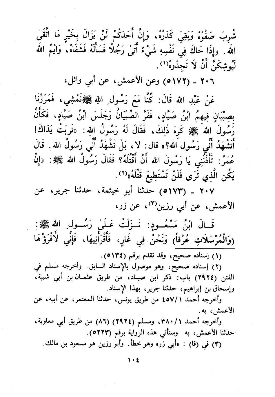 5172 - وَعَنِ الْأَعْمَشِ، عَنْ أَبِي وَائِلٍ، عَنْ عَبْدِ اللَّهِ قَالَ: كُنَّا مَعَ رَسُولِ اللَّهِ صَلَّى اللهُ عَلَيْهِ وَسَلَّمَ نَمْشِي، فَمَرَرْنَا بِصِبْيَانٍ فِيهِمُ ابْنُ صَيَّادٍ، فَفَرَّ الصِّبْيَانُ وَجَلَسَ ابْنُ الصَّيَادِ، فَكَأَنَّ رَسُولُ اللَّهِ صَلَّى اللهُ عَلَيْهِ وَسَلَّمَ كَرِهَ ذَلِكَ، فَقَالَ لَهُ رَسُولُ اللَّهِ صَلَّى اللهُ عَلَيْهِ وَسَلَّمَ: «تَرِبَتْ يَدَاكَ، §أَتَشْهَدُ أَنِّي رَسُولُ اللَّهِ؟»، قَالَ: لَا، بَلْ تَشْهَدُ أَنِّي رَسُولُ اللَّهِ، قَالَ عُمَرُ: تَأْذَنُنِي يَا رَسُولَ اللَّهِ أَنْ أَقْتُلَهُ؟ فَقَالَ رَسُولُ اللَّهِ صَلَّى اللهُ عَلَيْهِ وَسَلَّمَ: «إِنْ يَكُنِ الَّذِي تَرَى، فَلَنْ تَسْتَطِيعَ قَتْلَهُ» Kإسناده صحيح