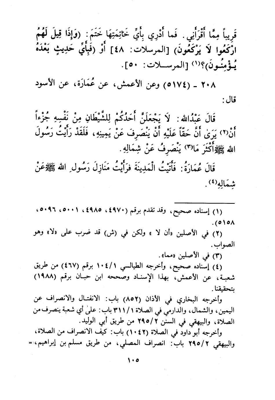 5174 - وَعَنِ الْأَعْمَشِ، عَنْ عُمَارَةَ، عَنِ الْأَسْوَدِ قَالَ: قَالَ عَبْدُ اللَّهِ: لَا يَجْعَلَنَّ أَحَدُكُمْ لِلشَّيْطَانِ مِنْ نَفْسِهِ جُزْءًا، أَنْ يَرَى أَنَّ حَقًّا عَلَيْهِ أَنْ يَنْصَرِفَ عَنْ يَمِينِهِ، «فَلَقَدْ §رَأَيْتُ رَسُولَ اللَّهِ صَلَّى اللهُ عَلَيْهِ وَسَلَّمَ أَكْثَرُ مَا يَنْصَرِفُ عَنْ شِمَالِهِ»، قَالَ عُمَارَةُ: فَأَتَيْتُ الْمَدِينَةَ فَرَأَيْتُ مَنَازِلَ رَسُولِ اللَّهِ صَلَّى اللهُ عَلَيْهِ وَسَلَّمَ عَنْ شِمَالِهِ "Kإسناده صحيح