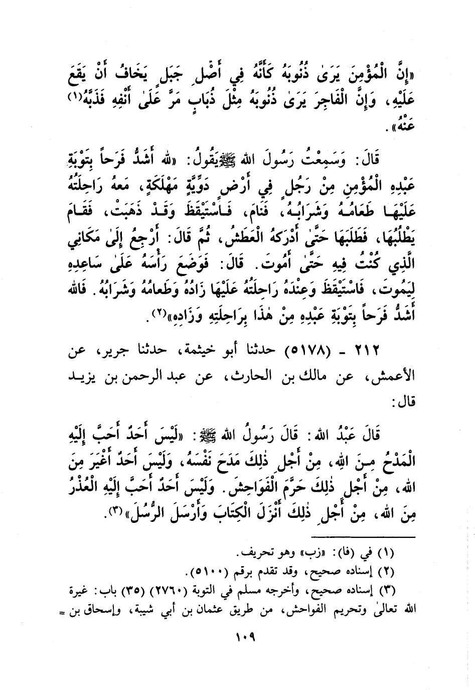 5178 - حَدَّثَنَا أَبُو خَيْثَمَةَ، حَدَّثَنَا جَرِيرٌ، عَنِ الْأَعْمَشِ، عَنْ مَالِكِ بْنِ الْحَارِثِ، عَنْ عَبْدِ الرَّحْمَنِ بْنِ يَزِيدَ قَالَ: قَالَ عَبْدُ اللَّهِ: قَالَ رَسُولُ اللَّهِ صَلَّى اللهُ عَلَيْهِ وَسَلَّمَ: «§لَيْسَ أَحَدٌ أَحَبَّ إِلَيْهِ الْمَدْحُ مِنَ اللَّهِ، مِنْ أَجْلِ ذَلِكَ مَدَحَ نَفْسَهُ، وَلَيْسَ أَحَدٌ أَغْيَرَ مِنَ اللَّهِ، مِنْ أَجْلِ ذَلِكَ حَرَّمَ الْفَوَاحِشَ، وَلَيْسَ أَحَدٌ أَحَبَّ إِلَيْهِ الْعُذْرُ مِنَ اللَّهِ، مِنْ أَجْلِ ذَلِكَ أَنْزَلَ الْكِتَابَ وَأَرْسَلَ الرُّسُلَ» Kإسناده صحيح