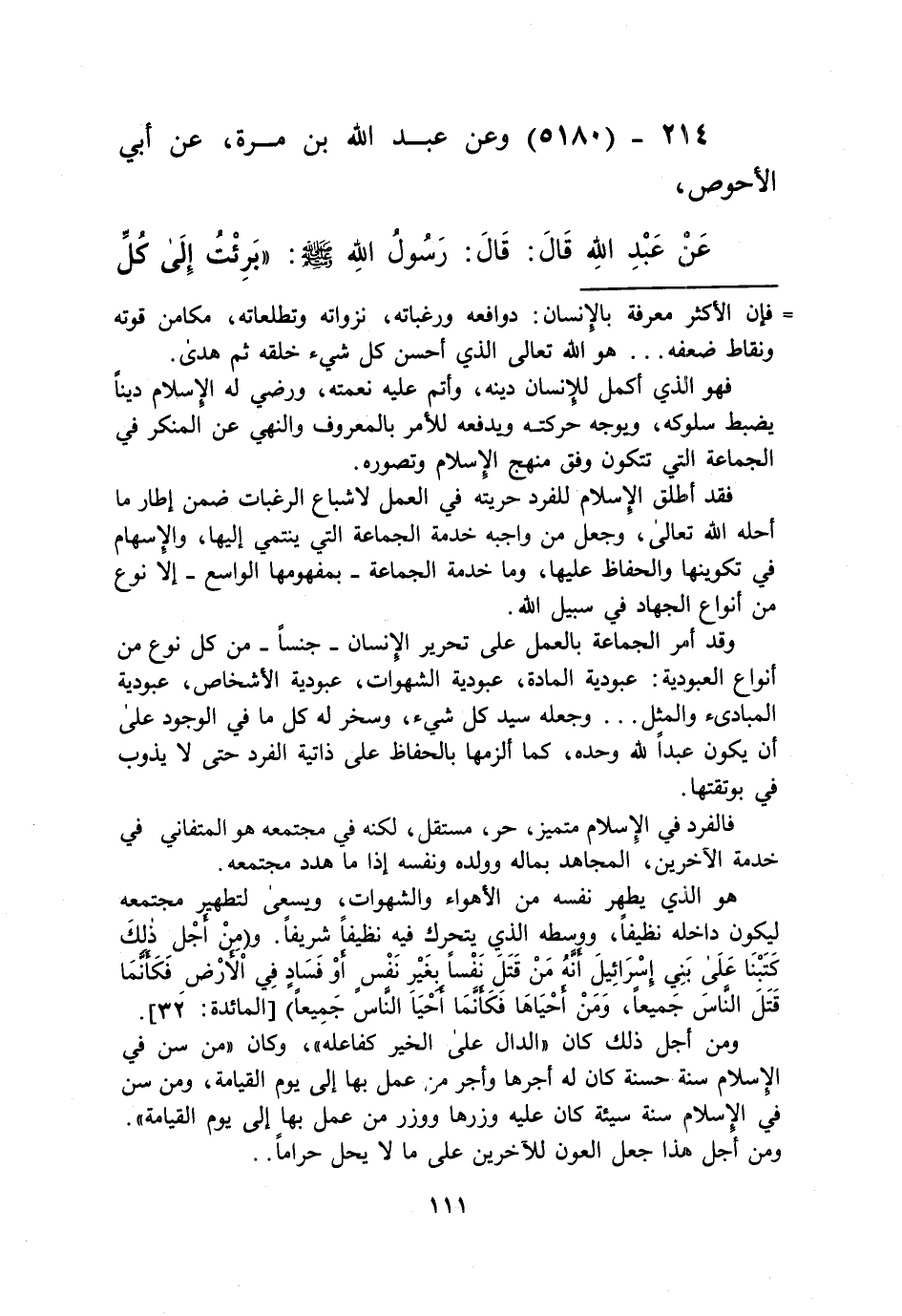 5180 - وَعَنْ عَبْدِ اللَّهِ بْنِ مُرَّةَ، عَنِ أَبِي الْأَحْوَصِ، عَنْ عَبْدِ اللَّهِ قَالَ: قَالَ رَسُولُ اللَّهِ صَلَّى اللهُ عَلَيْهِ وَسَلَّمَ: «§بَرِئْتُ إِلَى كُلِّ خَلِيلٍ مِنْ خُلَّتِهِ، وَلَوْ كُنْتُ مُتَّخِذًا خَلِيلًا لَاتَّخَذْتُ أَبَا بَكْرٍ خَلِيلًا، وَإِنَّ صَاحِبَكُمْ خَلِيلُ اللَّهِ» Kإسناده صحيح