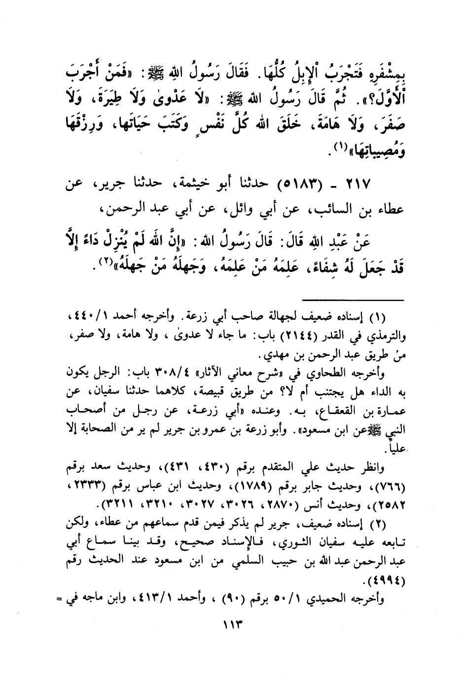 5183 - حَدَّثَنَا أَبُو خَيْثَمَةَ، حَدَّثَنَا جَرِيرٌ، عَنْ عَطَاءِ بْنِ السَّائِبِ، عَنْ أَبِي وَائِلٍ، عَنْ أَبِي عَبْدِ الرَّحْمَنِ، عَنْ عَبْدِ اللَّهِ قَالَ: قَالَ رَسُولُ اللَّهِ صَلَّى اللهُ عَلَيْهِ وَسَلَّمَ: «إِنَّ §اللَّهَ لَمْ يُنْزِلْ دَاءً إِلَّا جَعَلَ لَهُ شِفَاءً، عَلِمَهُ مَنْ عَلِمَهُ، وَجَهِلَهُ مَنْ جَهِلَهُ» Kإسناده ضعيف
