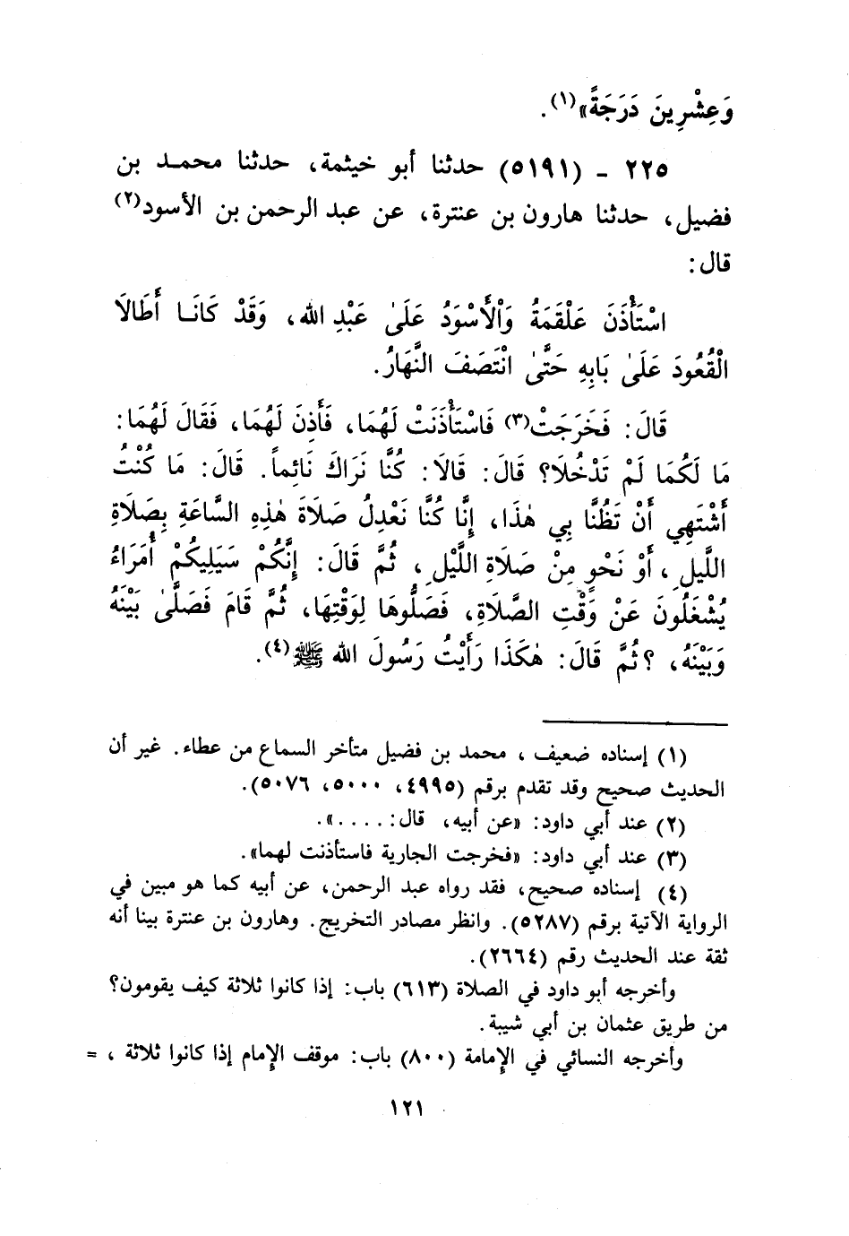 5191 - حَدَّثَنَا أَبُو خَيْثَمَةَ، حَدَّثَنَا مُحَمَّدُ بْنَ فُضَيْلٍ، حَدَّثَنَا هَارُونُ بْنُ عَنْتَرَةَ، عَنْ عَبْدِ الرَّحْمَنِ بْنِ الْأَسْوَدِ قَالَ: اسْتَأْذَنَ عَلْقَمَةُ وَالْأَسْوَدُ عَلَى عَبْدِ اللَّهِ، وَقَدْ كَانَا أَطَالَا الْقُعُودَ عَلَى بَابِهِ حَتَّى انْتَصَفَ النَّهَارُ، قَالَ: فَخَرَجْتُ فَاسْتَأْذَنْتُ لَهُمَا، فَأَذِنَ لَهُمَا، فَقَالَ لَهُمَا: مَا لَكُمَا لَمْ تَدْخُلَا؟ قَالَ: قَالَا: كُنَّا نَرَاكَ نَائِمًا، قَالَ: مَا كُنْتُ أَشْتَهِي أَنْ تَظُنَّا بِي هَذَا، إِنَّا كُنَّا نَعْدِلُ صَلَاةَ هَذِهِ السَّاعَةِ بِصَلَاةِ اللَّيْلِ، أَوْ نَحْوٍ مِنْ صَلَاةِ اللَّيْلِ، ثُمَّ قَالَ: إِنَّكُمْ سَيَلِيكُمْ أُمَرَاءُ يُشْغَلُونَ عَنْ وَقْتِ الصَّلَاةِ، فَصَلُّوهَا لِوَقْتِهَا، ثُمَّ §قَامَ فَصَلَّى بَيْنَهُ وَبَيْنَهُ، ثُمَّ قَالَ: «هَكَذَا رَأَيْتُ رَسُولَ اللَّهِ صَلَّى اللهُ عَلَيْهِ وَسَلَّمَ» Kإسناده صحيح