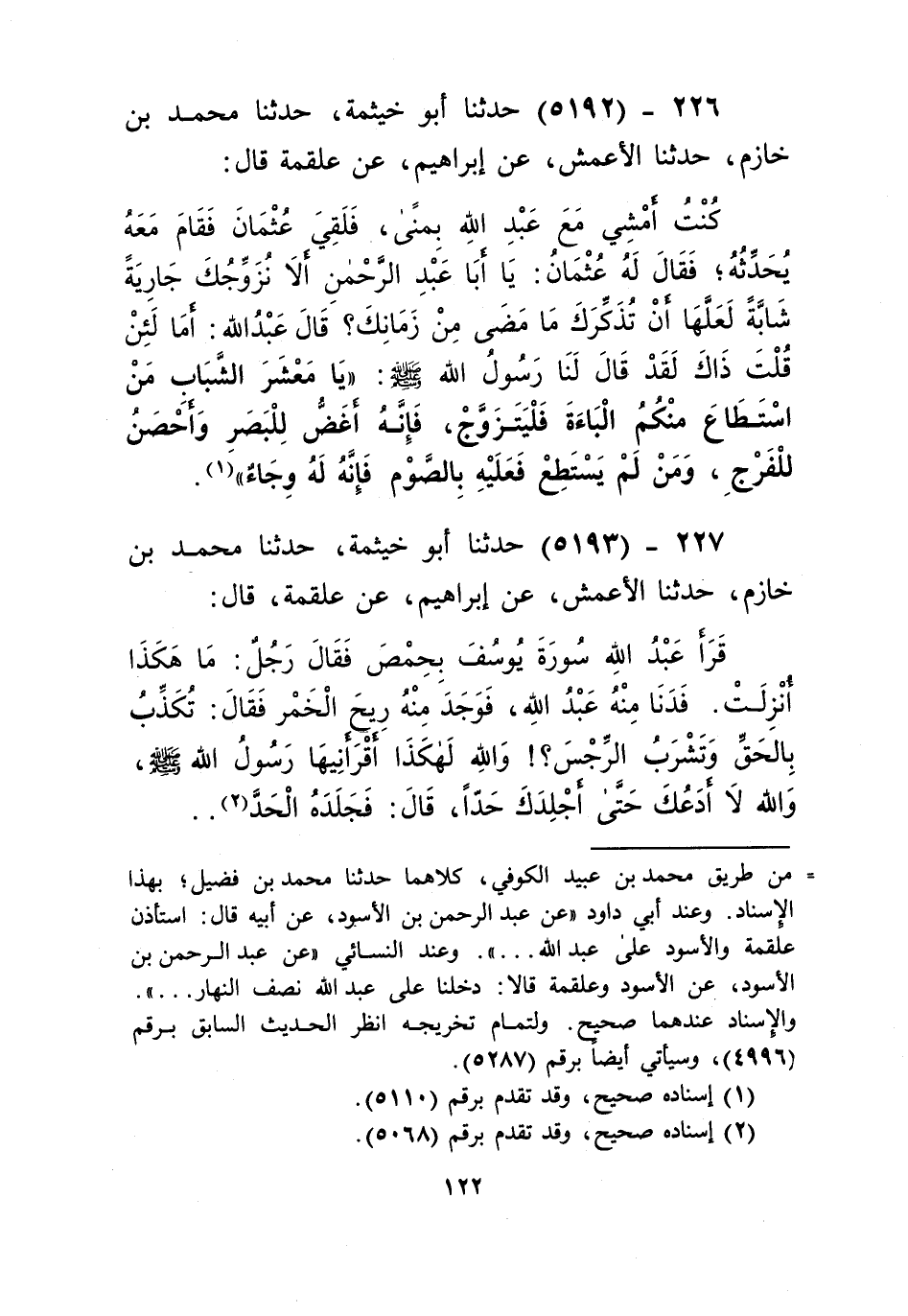 5192 - حَدَّثَنَا أَبُو خَيْثَمَةَ، حَدَّثَنَا مُحَمَّدُ بْنُ خَازِمٍ، حَدَّثَنَا الْأَعْمَشُ، عَنْ إِبْرَاهِيمَ، عَنْ عَلْقَمَةَ قَالَ: كُنْتُ أَمْشِي مَعَ عَبْدِ اللَّهِ بِمِنًى فَلَقِيَ عُثْمَانَ فَقَامَ مَعَهُ يُحَدِّثُهُ فَقَالَ لَهُ عُثْمَانُ: يَا أَبَا عَبْدِ الرَّحْمَنِ أَلَا نُزَوِّجُكَ جَارِيَةً شَابَّةً لَعَلَّهَا تُذَكِّرُكَ مَا مَضَى مِنْ زَمَانِكَ، قَالَ عَبْدُ اللَّهِ: أَمَا لَئِنْ قُلْتَ ذَاكَ، لَقَدْ قَالَ لَنَا رَسُولُ اللَّهِ صَلَّى اللهُ عَلَيْهِ وَسَلَّمَ: «يَا مَعْشَرَ الشَّبَابِ، §مَنِ اسْتَطَاعَ مِنْكُمُ الْبَاءَةَ فَلْيَتَزَوَّجْ، فَإِنَّهُ أَغَضُّ لِلْبَصَرِ وَأَحْصَنُ لِلْفَرْجِ، وَمَنْ لَمْ يَسْتَطِعْ فَعَلَيْهِ بِالصَّوْمِ، فَإِنَّهُ لَهُ وِجَاءٌ» Kإسناده صحيح