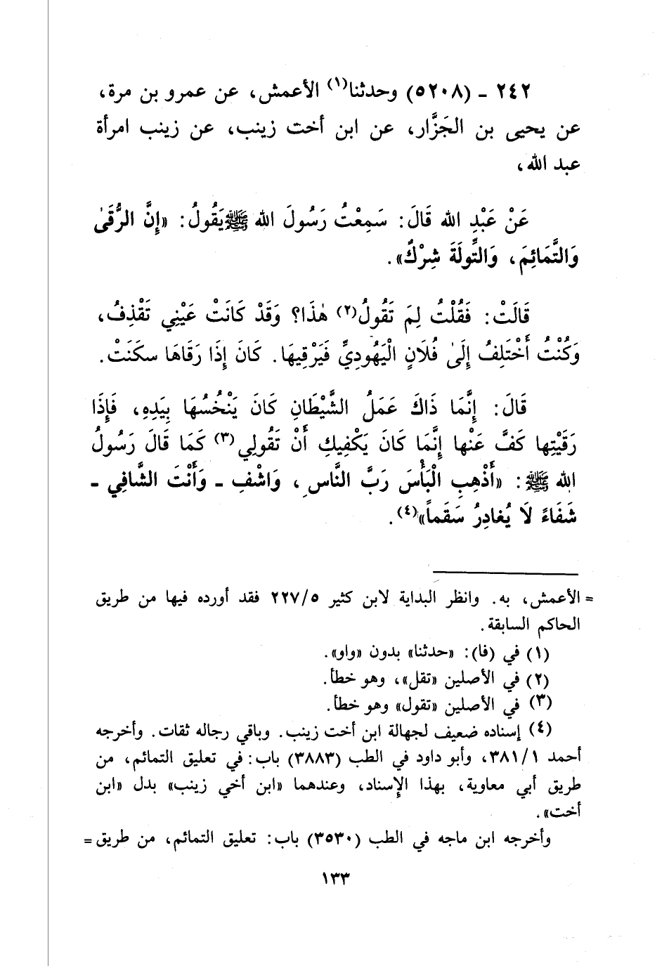5208 - وَحَدَّثَنَا الْأَعْمَشُ، عَنْ عَمْرِو بْنِ مُرَّةَ، عَنْ يَحْيَى الْجَزَّارِ، عَنِ ابْنِ أُخْتِ زَيْنَبَ، عَنْ زَيْنَبَ، امْرَأَةِ عَبْدِ اللَّهِ، عَنْ عَبْدِ اللَّهِ قَالَ: سَمِعْتُ رَسُولَ اللَّهِ صَلَّى اللهُ عَلَيْهِ وَسَلَّمَ يَقُولُ: «إِنَّ §الرُّقَى وَالتَّمَائِمَ وَالتُّوَلَةَ شِرْكٌ»، قَالَتْ: فَقُلْتُ: لَمَ تَقُولُ هَذَا؟ وَقَدْ كَانَتْ عَيْنِي تَقْذِفُ وَكُنْتُ أَخْتَلِفُ إِلَى فُلَانٍ الْيَهُودِيِّ فَيَرْقِيَهَا، كَانَ إِذَا رَقَاهَا سَكَنَتْ، قَالَ: إِنَّمَا ذَاكَ عَمَلُ الشَّيْطَانِ، كَانَ يَنْخُسُهَا بِيَدِهِ، فَإِذَا رَقَيْتِهَا كَفَّ عَنْهَا، إِنَّمَا يَكْفِيكِ أَنْ تَقُولِي كَمَا قَالَ رَسُولُ اللَّهِ صَلَّى اللهُ عَلَيْهِ وَسَلَّمَ: «أَذْهِبِ الْبَأْسَ رَبَّ النَّاسِ، وَاشْفِ - وَأَنْتَ الشَّافِي - شِفَاءً لَا يُغَادِرُ سَقَمًا» Kإسناده ضعيف