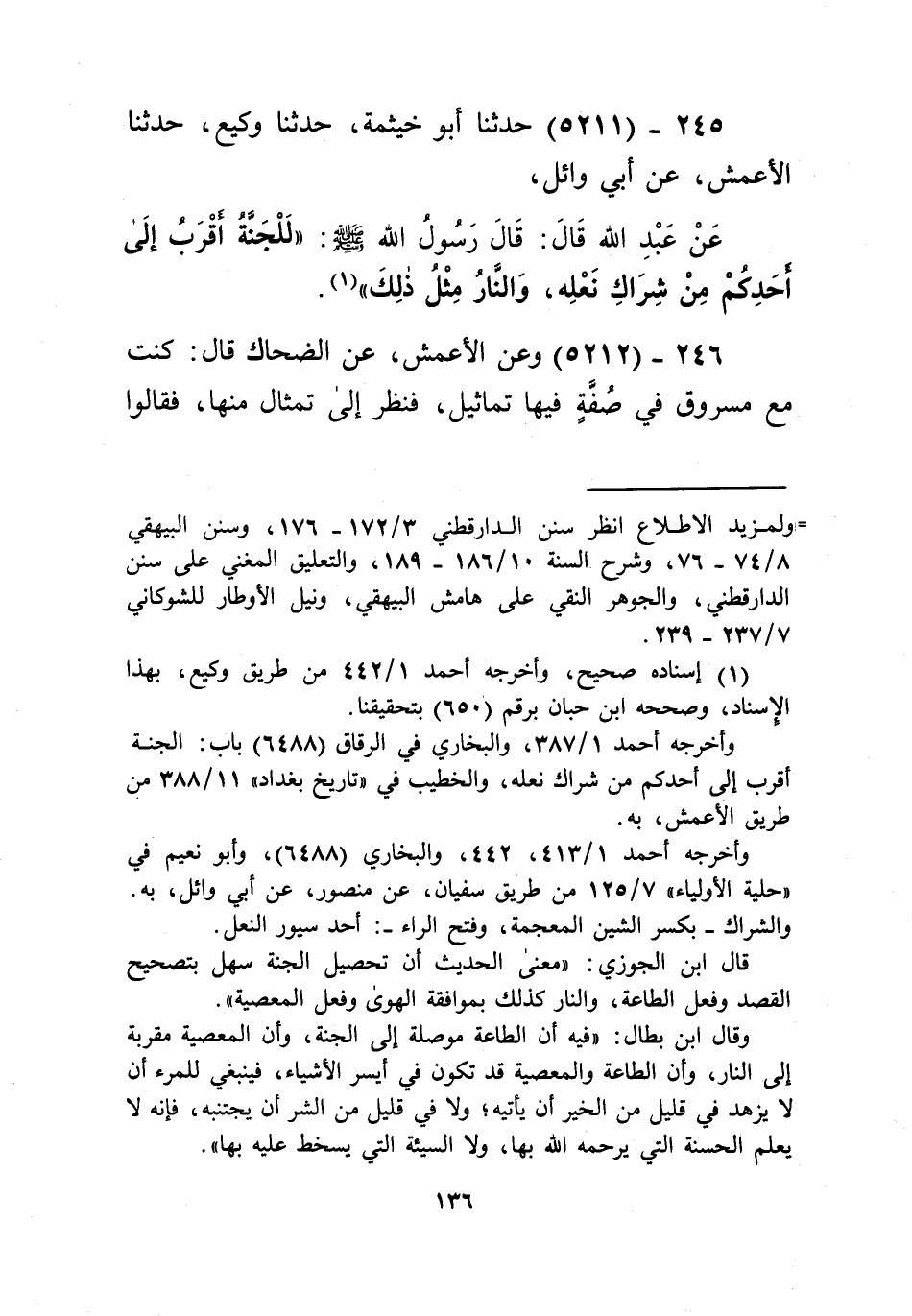 5211 - حَدَّثَنَا أَبُو خَيْثَمَةَ، حَدَّثَنَا وَكِيعٌ، حَدَّثَنَا الْأَعْمَشُ، عَنْ أَبِي وَائِلٍ، عَنْ عَبْدِ اللَّهِ قَالَ: قَالَ رَسُولُ اللَّهِ صَلَّى اللهُ عَلَيْهِ وَسَلَّمَ: «§لَلْجَنَّةُ أَقْرَبُ إِلَى أَحَدِكُمْ مِنْ شِرَاكِ نَعْلِهِ، وَالنَّارُ مِثْلُ ذَلِكَ» Kإسناده صحيح