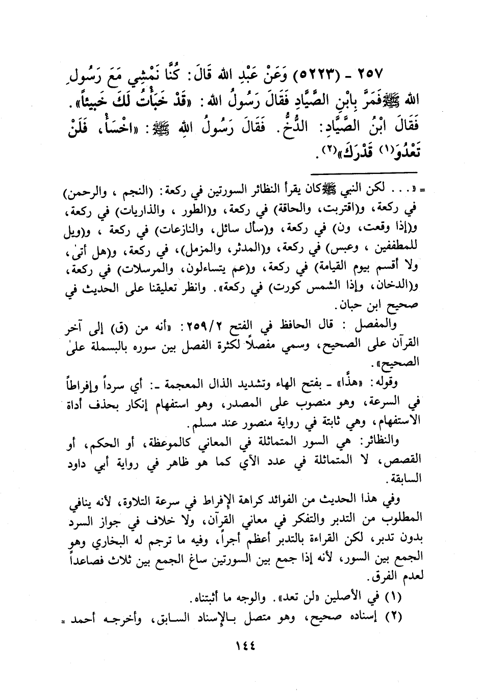 5223 - وَعَنْ عَبْدِ اللَّهِ قَالَ: كُنَّا نَمْشِي مَعَ رَسُولِ اللَّهِ صَلَّى اللهُ عَلَيْهِ وَسَلَّمَ فَمَرَّ بِابْنِ الصَّيَادِ، فَقَالَ رَسُولُ اللَّهِ صَلَّى اللهُ عَلَيْهِ وَسَلَّمَ: «§قَدْ خَبَّأْتُ لَكَ خَبِيئًا»، فَقَالَ ابْنُ الصَّيَادِ: الدُّخُّ، فَقَالَ رَسُولُ اللَّهِ صَلَّى اللهُ عَلَيْهِ وَسَلَّمَ: «اخْسَأْ، فَلَنْ تَعْدُوَ قَدْرَكَ» Kإسناده صحيح