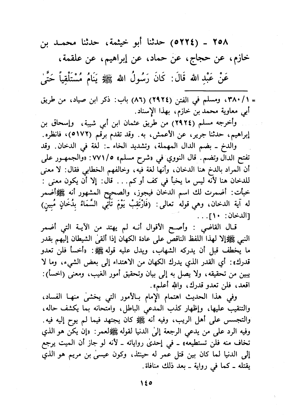 5224 - حَدَّثَنَا أَبُو خَيْثَمَةَ، حَدَّثَنَا مُحَمَّدُ بْنُ خَازِمٍ، عَنْ حَجَّاجٍ، عَنْ حَمَّادٍ، عَنْ إِبْرَاهِيمَ، عَنْ عَلْقَمَةَ، عَنْ عَبْدِ اللَّهِ قَالَ: «كَانَ رَسُولُ اللَّهِ صَلَّى اللهُ عَلَيْهِ وَسَلَّمَ §يَنَامُ مُسْتَلْقِيًا حَتَّى يَنْفُخَ، ثُمَّ يَقُومُ فَيُصَلِّي وَلَا يَتَوَضَّأُ» Kإسناده ضعيف
