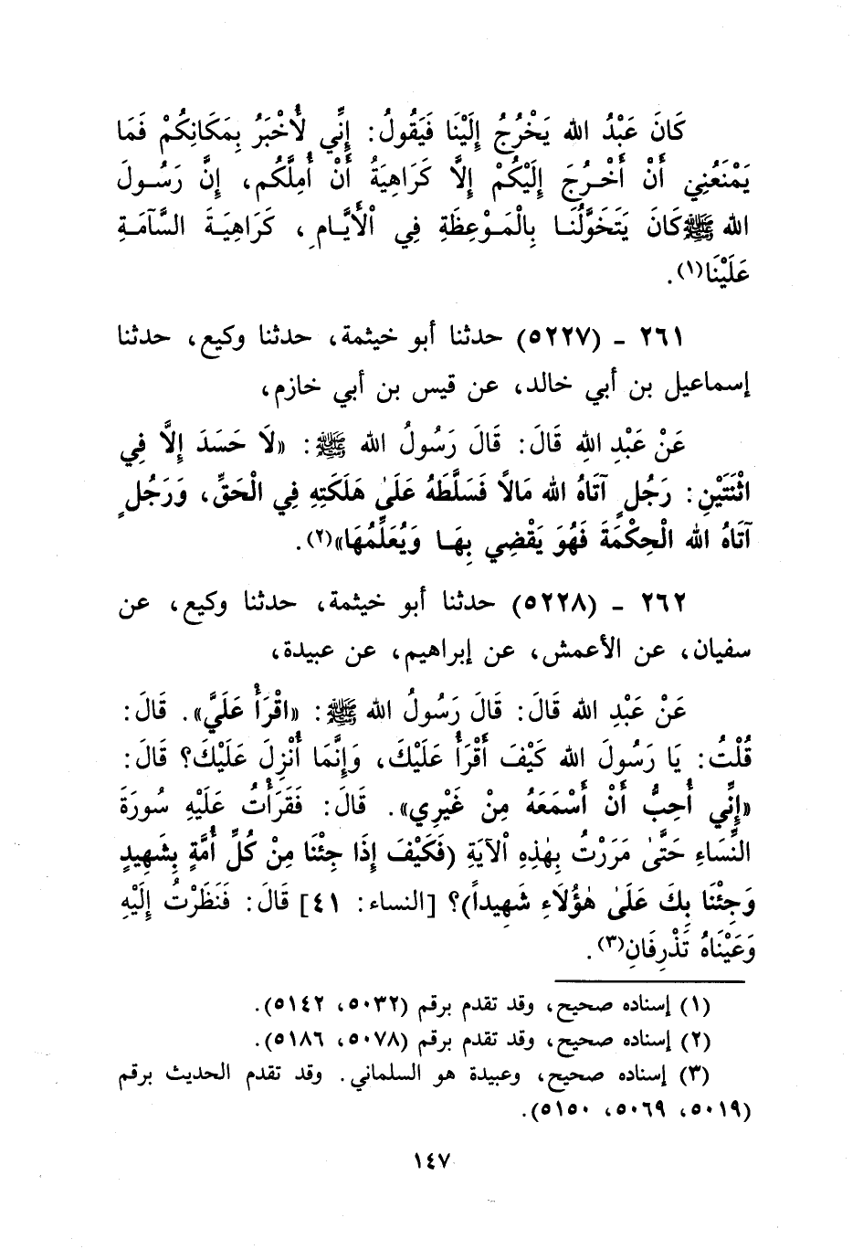 5228 - حَدَّثَنَا أَبُو خَيْثَمَةَ، حَدَّثَنَا وَكِيعٌ، عَنْ سُفْيَانَ، عَنِ الْأَعْمَشِ، عَنْ إِبْرَاهِيمَ، عَنْ عَبِيدَةَ، عَنْ عَبْدِ اللَّهِ قَالَ: قَالَ رَسُولُ اللَّهِ صَلَّى اللهُ عَلَيْهِ وَسَلَّمَ: «اقْرَأْ عَلَيَّ»، قَالَ: قُلْتُ: يَا رَسُولَ اللَّهِ: كَيْفَ أَقْرَأُ عَلَيْكَ، وَإِنَّمَا أُنْزِلَ عَلَيْكَ؟ قَالَ: «§إِنِّي أُحِبُّ أَنْ أَسْمَعَهُ مِنْ غَيْرِي»، قَالَ: فَقَرَأْتُ عَلَيْهِ سُورَةَ النِّسَاءِ، حَتَّى مَرَرْتُ بِهَذِهِ الْآيَةِ: {فَكَيْفَ إِذَا جِئْنَا مِنْ كُلِّ أُمَّةٍ بِشَهِيدٍ وَجِئْنَا بِكَ عَلَى هَؤُلَاءِ شَهِيدًا} [النساء: 41]، قَالَ: فَنَظَرْتُ إِلَيْهِ وَعَيْنَاهُ تَذْرِفَانِKإسناده صحيح