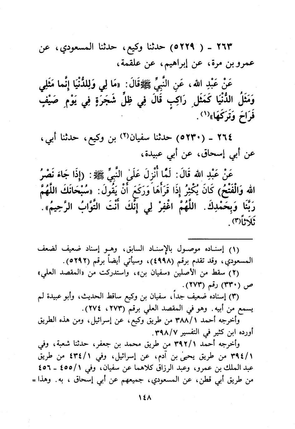 5229 - حَدَّثَنَا وَكِيعٌ، حَدَّثَنَا الْمَسْعُودِيُّ، عَنْ عَمْرِو بْنِ مُرَّةَ، عَنْ إِبْرَاهِيمَ، عَنْ عَلْقَمَةَ، عَنْ عَبْدِ اللَّهِ، عَنِ النَّبِيِّ صَلَّى اللهُ عَلَيْهِ وَسَلَّمَ قَالَ: «§مَا لِي وَلِلدُّنْيَا، إِنَّمَا مَثَلِي وَمَثَلُ الدُّنْيَا كَمَثَلِ رَاكِبٍ قَالَ فِي ظِلِّ شَجَرَةٍ فِي يَوْمِ صَيْفٍ فَرَاحَ وَتَرَكَهَا» Kإسناده ضعيف