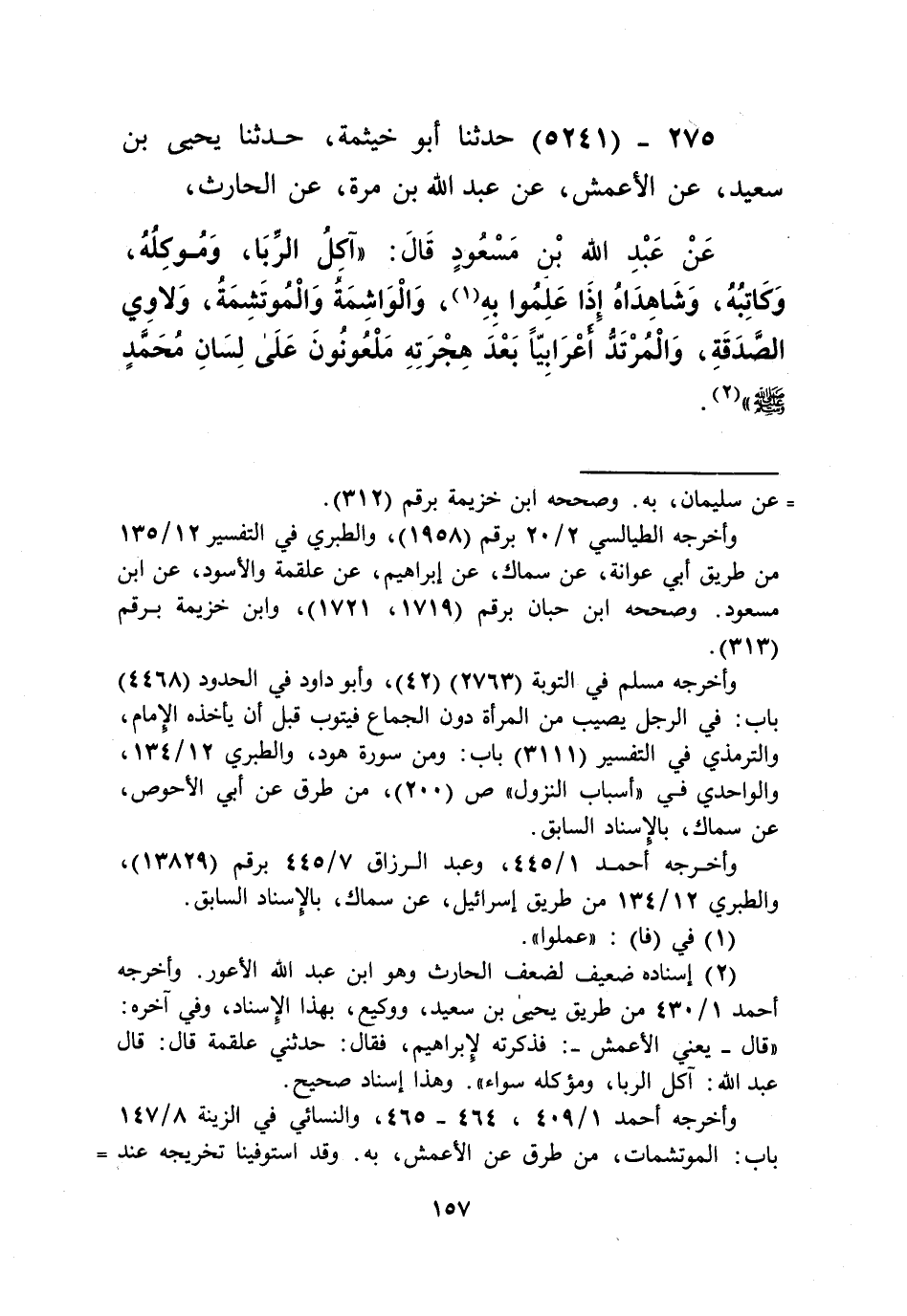 5241 - حَدَّثَنَا أَبُو خَيْثَمَةَ، حَدَّثَنَا يَحْيَى بْنُ سَعِيدٍ، عَنِ الْأَعْمَشِ، عَنْ عَبْدِ اللَّهِ بْنِ مُرَّةَ، عَنِ الْحَارِثِ، عَنْ عَبْدِ اللَّهِ بْنِ مَسْعُودٍ قَالَ: «§آكِلُ الرِّبَا، وَمُوكِلُهُ، وَكَاتِبُهُ، وَشَاهِدَاهُ إِذَا عَلِمُوا بِهِ، وَالْوَاشِمَةُ وَالْمُوتَشِمَةُ، وَلَاوِي الصَّدَقَةِ، وَالْمُرْتَدُّ أَعْرَابِيًّا بَعْدَ هِجْرَتِهِ مَلْعُونُونَ عَلَى لِسَانِ مُحَمَّدٍ صَلَّى اللهُ عَلَيْهِ وَسَلَّمَ» Kإسناده ضعيف