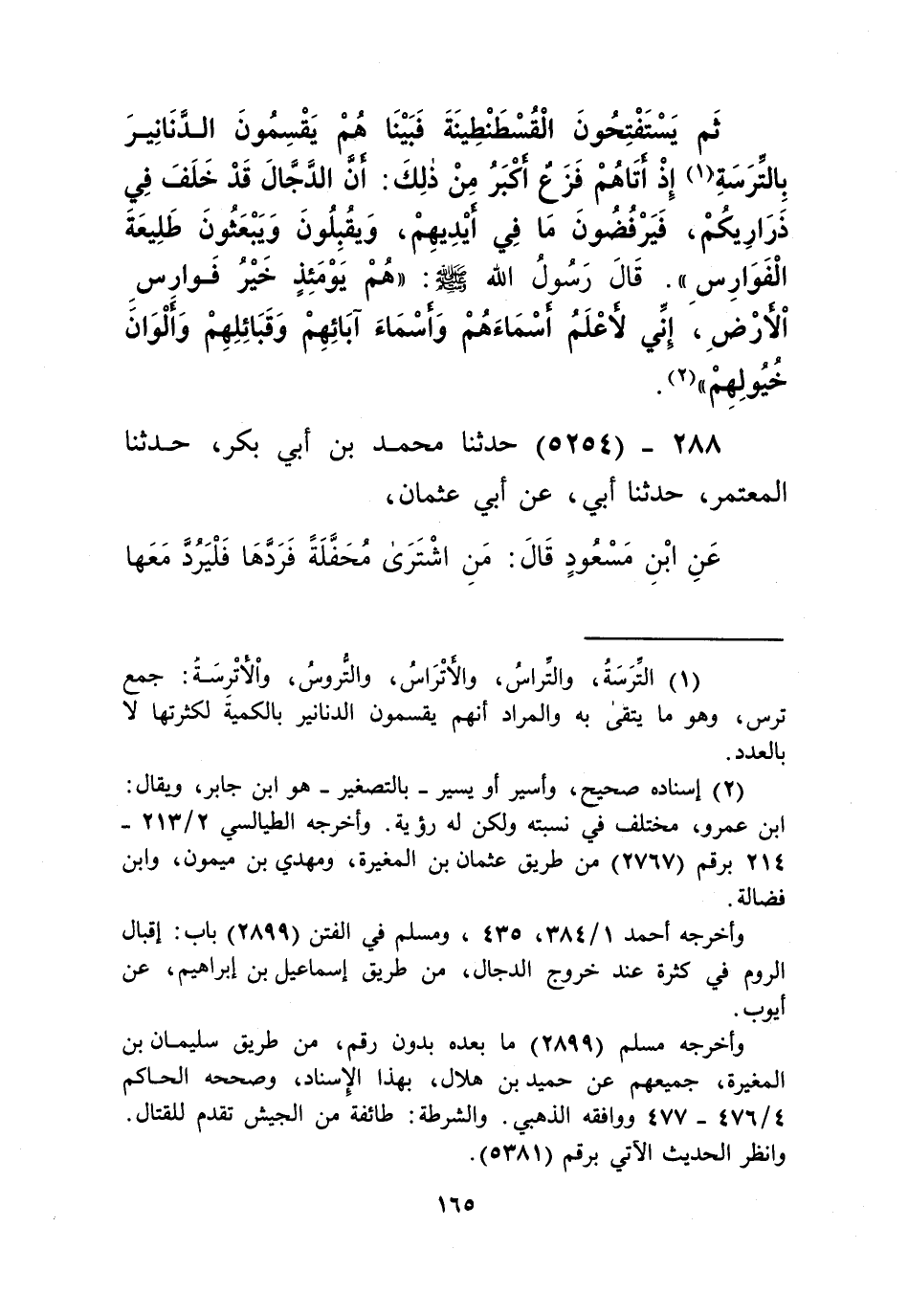 5254 - حَدَّثَنَا مُحَمَّدُ بْنُ أَبِي بَكْرٍ، حَدَّثَنَا الْمُعْتَمِرُ، حَدَّثَنَا أَبِي، عَنْ أَبِي عُثْمَانَ، عَنِ ابْنِ مَسْعُودٍ قَالَ: «§مَنِ اشْتَرَى مُحَفَّلَةً فَرَدَّهَا فَلْيَرُدَّ مَعَهَا صَاعًا» Kإسناده صحيح