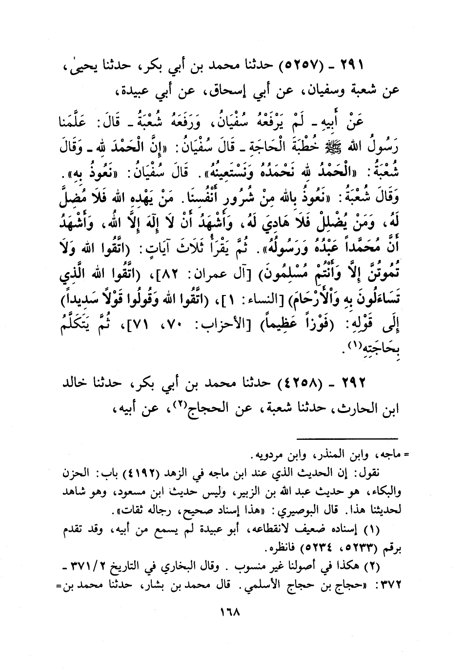 5257 - حَدَّثَنَا مُحَمَّدُ بْنُ أَبِي بَكْرٍ، حَدَّثَنَا يَحْيَى، عَنْ شُعْبَةَ، وَسُفْيَانَ، عَنْ أَبِي إِسْحَاقَ، عَنْ أَبِي عُبَيْدَةَ، عَنْ أَبِيهِ، - لَمْ يَرْفَعْهُ سُفْيَانُ، وَرَفَعَهُ شُعْبَةُ - قَالَ: عَلَّمَنَا رَسُولُ اللَّهِ صَلَّى اللهُ عَلَيْهِ وَسَلَّمَ خُطْبَةَ الْحَاجَةِ، - قَالَ سُفْيَانُ: «إِنَّ §الْحَمْدَ لِلَّهِ» وَقَالَ شُعْبَةُ: - «الْحَمْدُ لِلَّهِ نَحْمَدُهُ وَنَسْتَعِينُهُ» - قَالَ سُفْيَانُ: «نَعُوذُ بِهِ» وَقَالَ شُعْبَةُ: - «نَعُوذُ بِاللَّهِ مِنْ شُرُورِ أَنْفُسُنَا، مِنْ يَهْدِهِ اللَّهُ فَلَا مُضِلَّ لَهُ، وَمَنْ يُضْلِلْ فَلَا هَادِيَ لَهُ، وَأَشْهَدُ أَنْ لَا إِلَهَ إِلَّا اللَّهُ، وَأَشْهَدُ أَنَّ مُحَمَّدًا عَبْدُهُ وَرَسُولُهُ»، ثُمَّ يَقْرَأُ ثَلَاثَ آيَاتٍ: {اتَّقُوا اللَّهَ حَقَّ تُقَاتِهِ وَلَا تَمُوتُنَّ إِلَّا وَأَنْتُمْ مُسْلِمُونَ} [آل عمران: 102]، وَ {وَاتَّقُوا اللَّهَ الَّذِي تَسَاءَلُونَ بِهِ وَالْأَرْحَامَ} [النساء: 1]، وَ {اتَّقُوا اللَّهَ وَقُولُوا قَوْلًا سَدِيدًا} [الأحزاب: 70]، إِلَى قَوْلِهِ {فَوْزًا عَظِيمًا} [النساء: 73] ثُمَّ يَتَكَلَّمُ بِحَاجَتِهِKإسناده ضعيف
