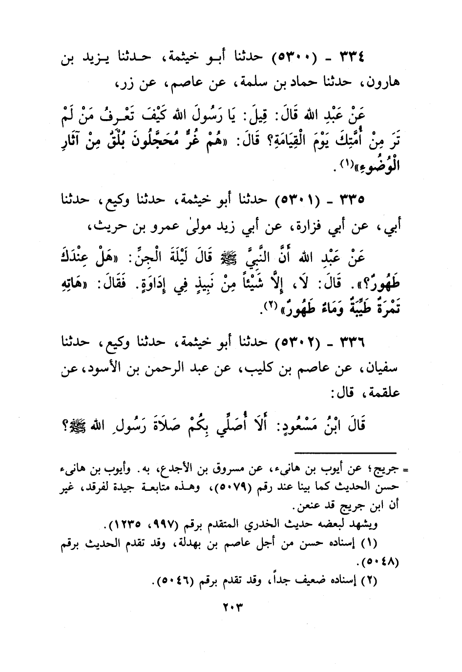 5300 - حَدَّثَنَا أَبُو خَيْثَمَةَ، حَدَّثَنَا يَزِيدُ بْنُ هَارُونَ، حَدَّثَنَا حَمَّادُ بْنُ سَلَمَةَ، عَنْ عَاصِمٍ، عَنْ زِرٍّ، عَنْ عَبْدِ اللَّهِ قَالَ: قِيلَ: يَا رَسُولَ اللَّهِ، كَيْفَ تَعْرِفُ مَنْ لَمْ تَرَ مِنْ أُمَّتِكَ يَوْمَ الْقِيَامَةِ؟ قَالَ: «§هُمْ غُرٌّ مُحَجَّلُونَ بُلْقٌ مِنْ آثَارِ الْوُضُوءِ» Kإسناده حسن
