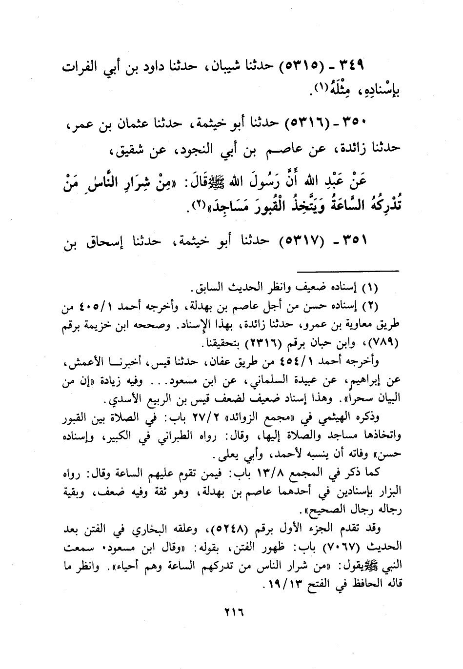 5316 - حَدَّثَنَا أَبُو خَيْثَمَةَ، حَدَّثَنَا عُثْمَانُ بْنُ عُمَرَ، حَدَّثَنَا زَائِدَةُ، عَنْ عَاصِمِ بْنِ أَبِي النَّجُودِ، عَنْ شَقِيقٍ، عَنْ عَبْدِ اللَّهِ، أَنَّ رَسُولَ اللَّهِ صَلَّى اللهُ عَلَيْهِ وَسَلَّمَ قَالَ: «§مِنْ شِرَارَ النَّاسِ مَنْ تُدْرِكْهُ السَّاعَةُ وَيَتَّخِذُ الْقُبُورَ مَسَاجِدَ» Kإسناده حسن