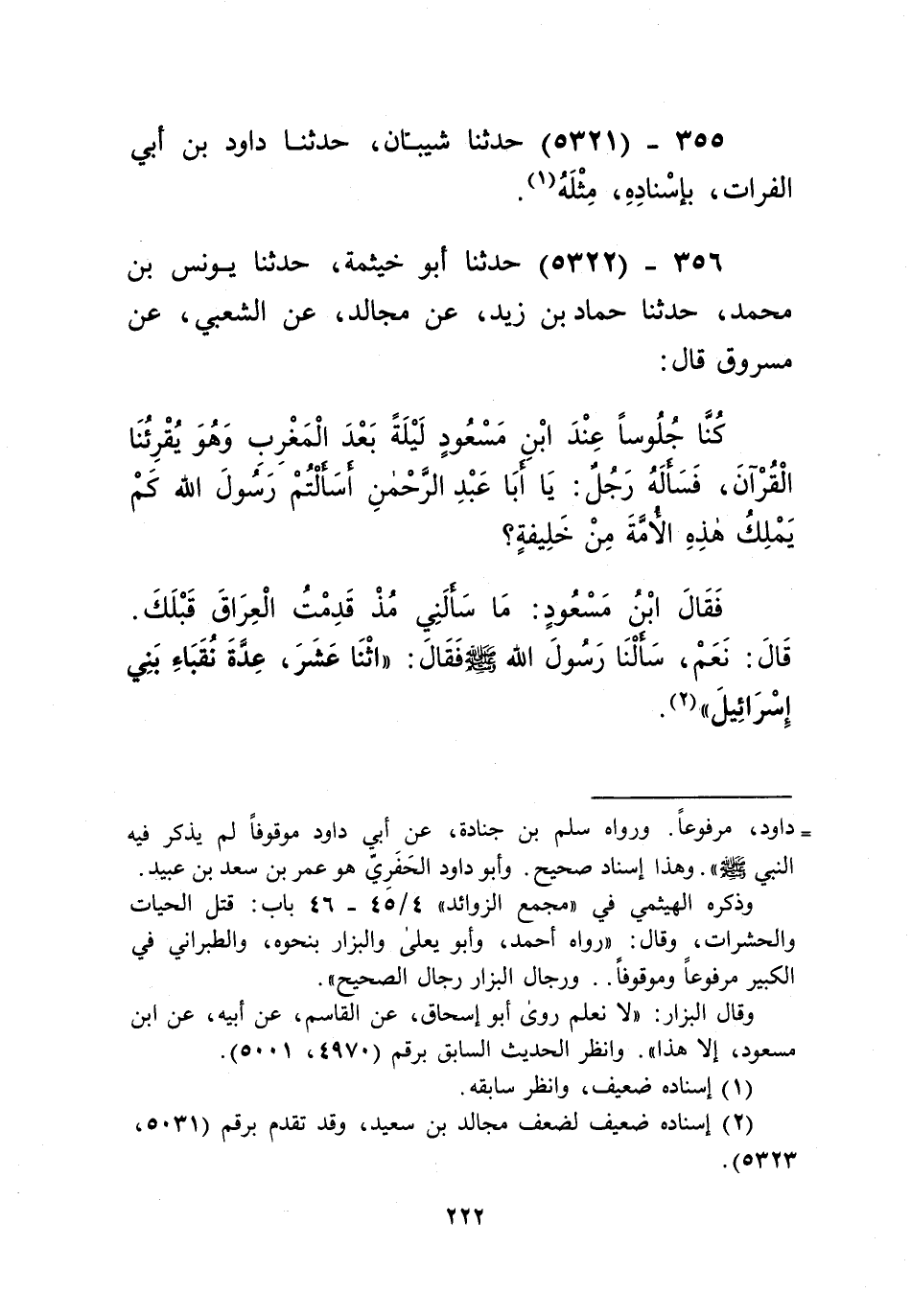 5322 - حَدَّثَنَا أَبُو خَيْثَمَةَ، حَدَّثَنَا يُونُسُ بْنُ مُحَمَّدٍ، حَدَّثَنَا حَمَّادُ بْنُ زَيْدٍ، عَنْ مُجَالِدٍ، عَنِ الشَّعْبِيِّ، عَنْ مَسْرُوقٍ قَالَ: كُنَّا جُلُوسًا عِنْدَ ابْنِ مَسْعُودٍ لَيْلَةً بَعْدَ الْمَغْرِبِ وَهُوَ يُقْرِئُنَا الْقُرْآنَ، فَسَأَلَهُ رَجُلٌ: يَا أَبَا عَبْدِ الرَّحْمَنِ، أَسَأَلْتُمْ رَسُولَ اللَّهِ كَمْ يَمْلِكُ هَذِهِ الْأُمَّةَ مِنْ خَلِيفَةٍ؟ فَقَالَ ابْنُ مَسْعُودٍ: مَا سَأَلَنِي مُذْ قَدِمَتُ الْعِرَاقَ قَبْلَكَ، قَالَ: نَعَمْ، سَأَلْنَا رَسُولَ اللَّهِ صَلَّى اللهُ عَلَيْهِ وَسَلَّمَ فَقَالَ: «§اثْنَا عَشَرَ، عِدَّةَ نُقَبَاءِ بَنِي إِسْرَائِيلَ»