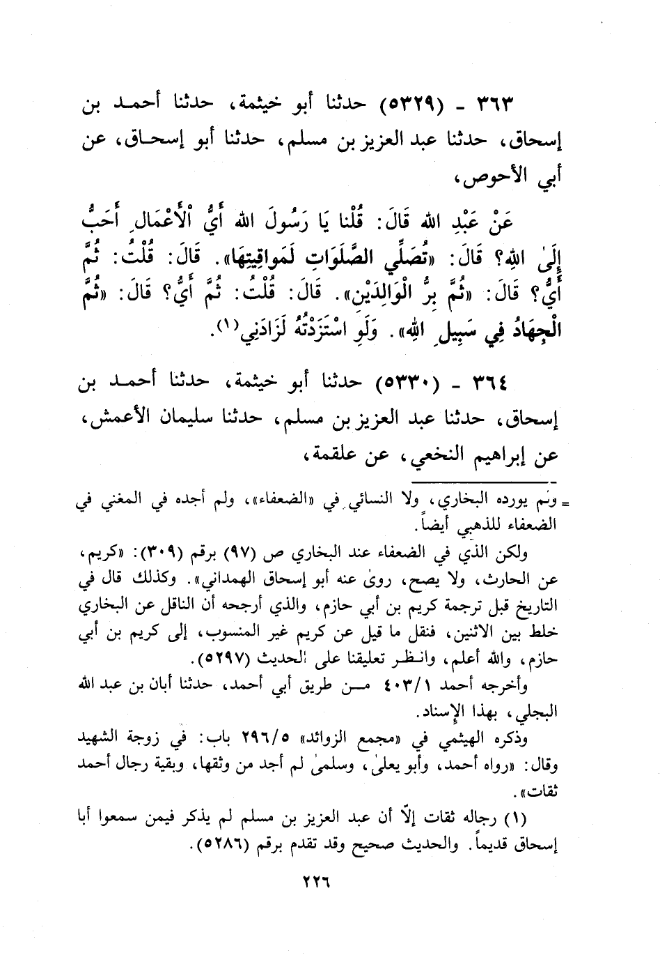 5329 - حَدَّثَنَا أَبُو خَيْثَمَةَ، حَدَّثَنَا أَحْمَدُ بْنُ إِسْحَاقَ، حَدَّثَنَا عَبْدُ الْعَزِيزِ بْنُ مُسْلِمٍ، حَدَّثَنَا أَبُو إِسْحَاقَ، عَنْ أَبِي الْأَحْوَصِ، عَنْ عَبْدِ اللَّهِ قَالَ: قُلْنَا: يَا رَسُولَ اللَّهِ، أَيُّ الْأَعْمَالِ أَحَبُّ إِلَى اللَّهِ؟ قَالَ: «§تُصَلِّي الصَّلَوَاتِ لِمَوَاقِيتِهَا»، قَالَ: قُلْتُ: ثُمَّ أَيُّ؟ قَالَ: «ثُمَّ بِرُّ الْوَالِدَيْنِ»، قَالَ: قُلْتُ: ثُمَّ أَيُّ؟ قَالَ: «ثُمَّ الْجِهَادُ فِي سَبِيلِ اللَّهِ»، وَلَوِ اسْتَزَدْتُهُ لَزَادَنِيKرجاله ثقات والحديث صحيح