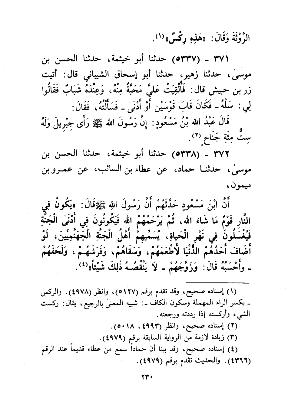 5338 - حَدَّثَنَا أَبُو خَيْثَمَةَ، حَدَّثَنَا الْحَسَنُ بْنُ مُوسَى، حَدَّثَنَا حَمَّادٌ، عَنْ عَطَاءِ بْنِ السَّائِبِ، عَنْ عَمْرِو بْنِ مَيْمُونٍ، أَنَّ ابْنَ مَسْعُودٍ حَدَّثَهُمْ، أَنَّ رَسُولَ اللَّهِ صَلَّى اللهُ عَلَيْهِ وَسَلَّمَ قَالَ: " §يَكُونُ فِي النَّارِ قَوْمٌ مَا شَاءَ اللَّهُ، ثُمَّ يَرْحَمُهُمُ اللَّهُ فَيَكُونُونَ فِي أَدْنَى الْجَنَّةِ، فَيُغْسَلُونَ فِي نَهَرِ الْحَيَاةِ، يُسَمِّيهِمْ أَهْلُ الْجَنَّةِ الْجَهَنَّمِيِّينَ، لَوْ أَضَافَ أَحَدُهُمُ الدُّنْيَا لَأَطْعَمَهُمْ وَسَقَاهُمْ وَفَرَشَهُمْ وَلَحَفَهُمْ - وَأَحْسَبُهُ قَالَ: وَزَوَّجَهُمْ - لَا يُنْقِصُهُ ذَلِكَ شَيْئًا "Kإسناده صحيح