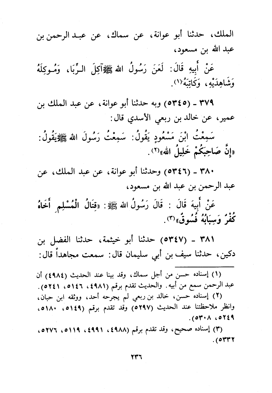 5346 - وَحَدَّثَنَا أَبُو عَوَانَةَ، عَنْ عَبْدِ الْمَلِكِ، عَنْ عَبْدِ الرَّحْمَنِ بْنِ عَبْدِ اللَّهِ بْنِ مَسْعُودٍ، عَنْ أَبِيهِ قَالَ: قَالَ رَسُولُ اللَّهِ صَلَّى اللهُ عَلَيْهِ وَسَلَّمَ: «§قِتَالُ الْمُسْلِمِ أَخَاهُ كُفْرٌ، وَسِبَابُهُ فُسُوقٌ» Kإسناده صحيح