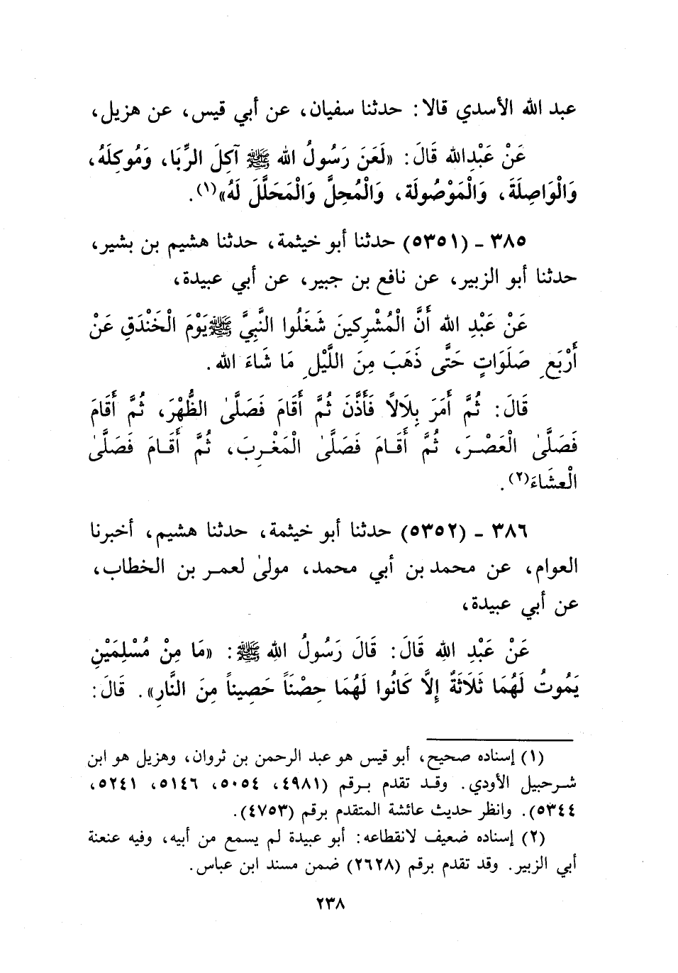 5352 - حَدَّثَنَا أَبُو خَيْثَمَةَ، حَدَّثَنَا هُشَيْمٌ، أَخْبَرَنَا الْعَوَّامُ، عَنْ مُحَمَّدِ بْنِ أَبِي مُحَمَّدٍ، - مَوْلًى لِعُمَرَ بْنِ الْخَطَّابِ - عَنْ أَبِي عُبَيْدَةَ، عَنْ عَبْدِ اللَّهِ قَالَ: قَالَ رَسُولُ اللَّهِ صَلَّى اللهُ عَلَيْهِ وَسَلَّمَ: «§مَا مِنْ مُسْلِمَيْنِ يَمُوتُ لَهُمَا ثَلَاثٌ إِلَّا كَانُوا لَهُمَا حِصْنًا حَصِينًا مِنَ النَّارِ»، قَالَ: فَقُلْنَا: يَا رَسُولَ اللَّهِ، وَإِنْ كَانَا اثْنَيْنِ؟ قَالَ: «وَإِنْ كَانَا اثْنَيْنِ»، قَالَ: فَقَالَ أَبُو ذَرٍّ: يَا رَسُولَ اللَّهِ، لَمْ أُقَدِّمْ إِلَّا اثْنَيْنِ؟ قَالَ: «وَإِنْ كَانَا اثْنَيْنِ»، قَالَ: فَقَالَ أُبَيُّ بْنُ كَعْبٍ أَبُو الْمُنْذِرِ سَيِّدُ الْقُرَّاءِ: لَمْ أَقْدَمْ إِلَّا وَاحِدًا؟ قَالَ: «وَإِنْ كَانَ وَاحِدًا»، قَالَ: «إِنَّمَا ذَلِكَ عِنْدَ الصَّدْمَةِ الْأُولَى» Kإسناده ضعيف
