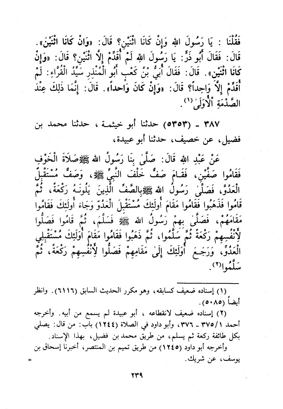 5353 - حَدَّثَنَا أَبُو خَيْثَمَةَ، حَدَّثَنَا مُحَمَّدُ بْنُ فُضَيْلٍ، عَنْ خُصَيْفٍ، حَدَّثَنَا أَبُو عُبَيْدَةَ، عَنْ عَبْدِ اللَّهِ قَالَ: «§صَلَّى بِنَا رَسُولُ اللَّهِ صَلَّى اللهُ عَلَيْهِ وَسَلَّمَ صَلَاةَ الْخَوْفِ، فَقَامُوا صَفَّيْنِ، فَقَامَ صَفٌّ خَلْفَ النَّبِيِّ صَلَّى اللهُ عَلَيْهِ وَسَلَّمَ، وَصَفٌّ مُسْتَقْبِلٌ الْعَدُوَّ، فَصَلَّى رَسُولُ اللَّهِ صَلَّى اللهُ عَلَيْهِ وَسَلَّمَ بِالصَّفِّ الَّذِينَ يَلُونَهُ رَكْعَةً، ثُمَّ قَامُوا فَذَهَبُوا فَقَامُوا مَقَامَ أُولَئِكَ مُسْتَقْبِلَ الْعَدُوِّ، وَجَاءَ أُولَئِكَ فَقَامُوا مَقَامَهُمْ، فَصَلَّى بِهِمْ رَسُولُ اللَّهِ صَلَّى اللهُ عَلَيْهِ وَسَلَّمَ فَسَلَّمَ، ثُمَّ قَامُوا فَصَلَّوْا لِأَنْفُسِهِمْ رَكْعَةً ثُمَّ سَلِّمُوا، ثُمَّ ذَهَبُوا فَقَامُوا مَقَامَ أُولَئِكَ مُسْتَقْبِلِي الْعَدُوَّ، وَرَجَعَ أُولَئِكَ إِلَى مَقَامِهِمْ فَصَلَّوْا لِأَنْفُسِهِمْ رَكْعَةً، ثُمَّ سَلَّمُوا» Kإسناده ضعيف