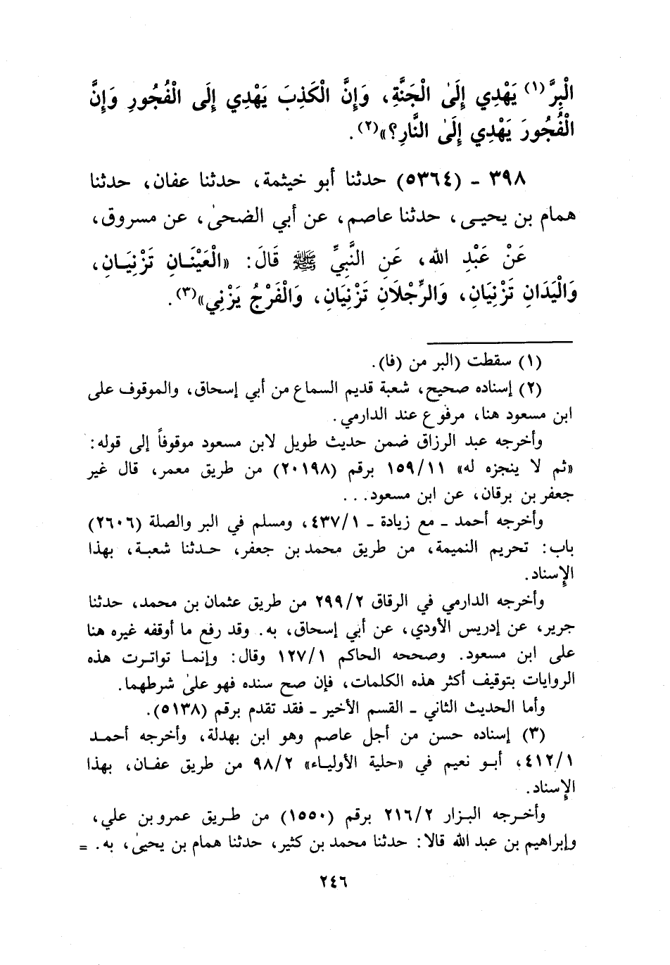 5364 - حَدَّثَنَا أَبُو خَيْثَمَةَ، حَدَّثَنَا عَفَّانُ، حَدَّثَنَا هَمَّامُ بْنُ يَحْيَى، حَدَّثَنَا عَاصِمٌ، عَنْ أَبِي الضُّحَى، عَنْ مَسْرُوقٍ، عَنْ عَبْدِ اللَّهِ، عَنِ النَّبِيِّ صَلَّى اللهُ عَلَيْهِ وَسَلَّمَ قَالَ: «§الْعَيْنَانِ تَزْنِيَانِ، وَالْيَدَانِ تَزْنِيَانِ، وَالرِّجْلَانِ تَزْنِيَانِ، وَالْفَرْجُ يَزْنِي» Kإسناده حسن