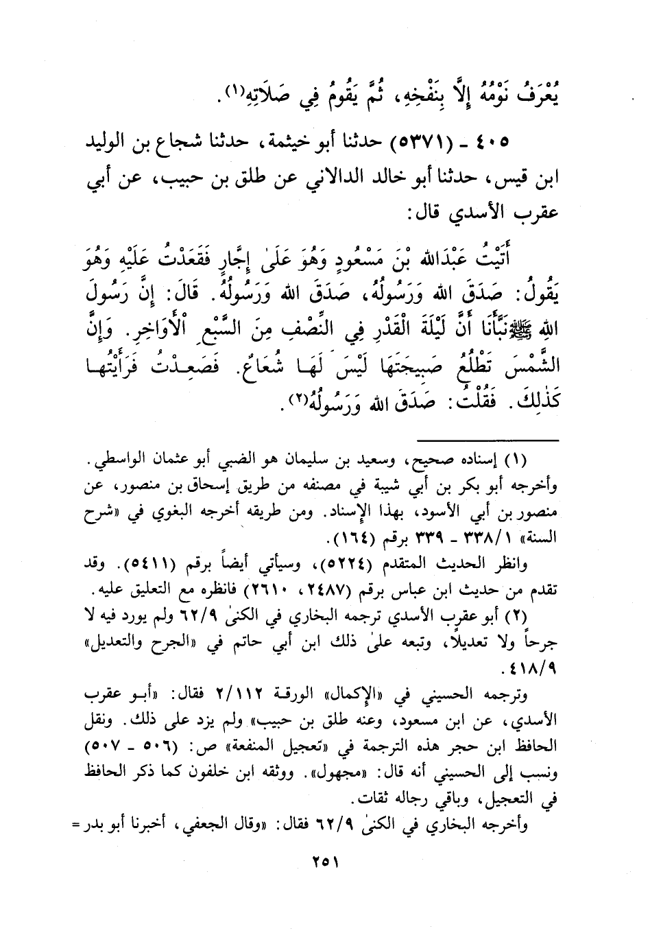 5371 - حَدَّثَنَا أَبُو خَيْثَمَةَ، حَدَّثَنَا شُجَاعُ بْنُ الْوَلِيدِ بْنِ قَيْسٍ، حَدَّثَنَا أَبُو خَالِدٍ الدَّالَانِيُّ، عَنْ طَلْقِ بْنِ حَبِيبٍ، عَنْ أَبِي عَقْرَبٍ الْأَسَدِيِّ قَالَ: أَتَيْتُ عَبْدَ اللَّهِ بْنَ مَسْعُودٍ وَهُوَ عَلَى إِجَّارٍ فَقَعَدْتُ عَلَيْهِ وَهُوَ يَقُولُ: صَدَقَ اللَّهُ وَرَسُولُهُ، صَدَقَ اللَّهُ وَرَسُولُهُ، قَالَ: إِنَّ رَسُولَ اللَّهِ صَلَّى اللهُ عَلَيْهِ وَسَلَّمَ نَبَّأَنَا «أَنَّ §لَيْلَةَ الْقَدْرِ فِي النِّصْفِ مِنَ السَّبْعِ الْأَوَاخِرِ، وَإِنَّ الشَّمْسَ تَطْلُعُ صَبِيحَتَهَا لَيْسَ لَهَا شُعَاعٌ»، فَصَعَدْتُ فَرَأَيْتُهَا كَذَلِكَ، فَقُلْتُ: صَدَقَ اللَّهُ وَرَسُولُهُ