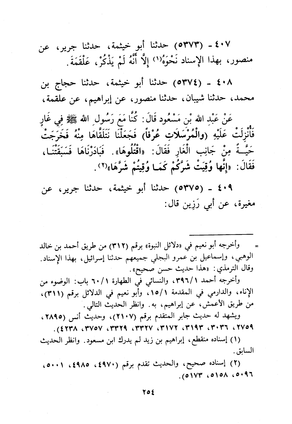 5374 - حَدَّثَنَا أَبُو خَيْثَمَةَ، حَدَّثَنَا حَجَّاجُ بْنُ مُحَمَّدٍ، حَدَّثَنَا شَيْبَانُ، حَدَّثَنَا مَنْصُورٌ، عَنْ إِبْرَاهِيمَ، عَنْ عَلْقَمَةَ، عَنْ عَبْدِ اللَّهِ بْنِ مَسْعُودٍ قَالَ: كُنَّا مَعَ رَسُولِ اللَّهِ صَلَّى اللهُ عَلَيْهِ وَسَلَّمَ فِي غَارٍ، فَأُنْزِلَتْ عَلَيْهِ: وَالْمُرْسَلَاتِ عُرْفًا فَجَعَلْنَا نَتَلَقَّاهَا مِنْهُ، فَخَرَجَتْ حَيَّةٌ مِنْ جَانِبِ الْغَارِ، فَقَالَ: «اقْتُلُوهَا». فَبَادَرْنَاهَا فَسَبَقَتْنَا، فَقَالَ: «§إِنَّهَا وُقِيَتْ شَرَّكُمْ كَمَا وُقِيتُمْ شَرَّهَا» Kإسناده صحيح