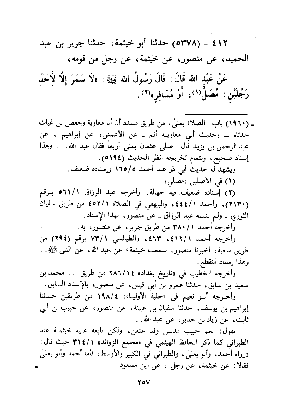 5378 - حَدَّثَنَا أَبُو خَيْثَمَةَ، حَدَّثَنَا جَرِيرُ بْنُ عَبْدِ الْحَمِيدِ، عَنْ مَنْصُورٍ، عَنْ خَيْثَمَةَ، عَنْ رَجُلٍ، مِنْ قَوْمِهِ، عَنْ عَبْدِ اللَّهِ قَالَ: قَالَ رَسُولُ اللَّهِ صَلَّى اللهُ عَلَيْهِ وَسَلَّمَ: " §لَا سَمَرَ إِلَّا لِأَحَدِ رَجُلَيْنِ: مُصَلٍّ، أَوْ مُسَافِرٍ "Kإسناده ضعيف