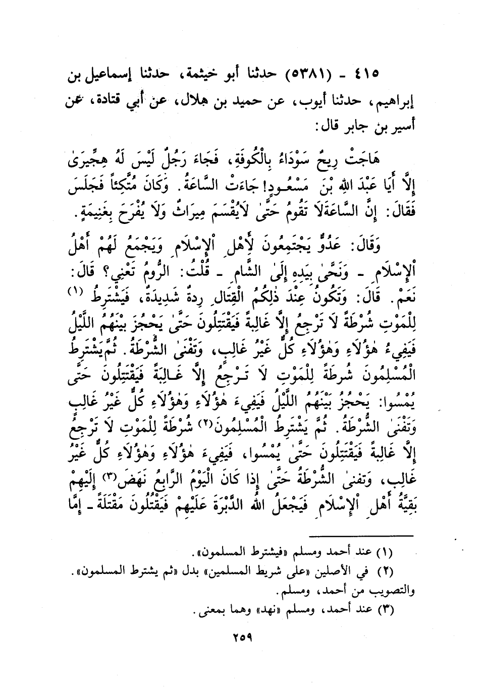 5381 - حَدَّثَنَا أَبُو خَيْثَمَةَ، حَدَّثَنَا إِسْمَاعِيلُ بْنُ إِبْرَاهِيمَ، حَدَّثَنَا أَيُّوبُ، عَنْ حُمَيْدِ بْنِ هِلَالٍ، عَنْ أَبِي قَتَادَةَ، عَنْ أُسَيْرِ بْنِ جَابِرٍ قَالَ: هَاجَتْ رِيحٌ سَوْدَاءُ بِالْكُوفَةِ، فَجَاءَ رَجُلٌ لَيْسَ لَهُ هِجِّيرَى، إِلَّا: أَيَا عَبْدَ اللَّهِ بْنَ مَسْعُودٍ جَاءَتِ السَّاعَةُ، وَكَانَ مُتَّكِئًا فَجَلَسَ فَقَالَ: " إِنَّ §السَّاعَةَ لَا تَقُومُ حَتَّى لَا يُقْسَمَ مِيرَاثٌ وَلَا يُفْرَحَ بِغَنِيمَةٍ، وَقَالَ: عَدُوٌّ يَجْتَمِعُونَ لِأَهْلِ الْإِسْلَامِ، وَيَجْمَعُ لَهُمْ أَهْلُ الْإِسْلَامِ - وَنَحَّى بِيَدِهِ إِلَى الشَّامِ - " قُلْتُ: الرُّومَ تَعْنِي؟ قَالَ: «نَعَمْ»، قَالَ: " وَتَكُونُ عِنْدَ ذَلِكُمُ الْقِتَالُ رِدَّةٌ شَدِيدَةٌ، فَيَشْتَرِطُ لِلْمَوْتِ شُرْطَةً لَا تَرْجِعُ إِلَّا غَالِبَةً فَيَقْتَتِلُونَ حَتَّى يَحْجُزَ بَيْنَهُمُ اللَّيْلُ، فَيَفِيءُ هَؤُلَاءِ وَهَؤُلَاءِ كُلٌّ غَيْرُ غَالِبٍ، وَتَفْنَى الشُّرْطَةُ، ثُمَّ يَشْتَرِطُ الْمُسْلِمُونَ شُرْطَةً لِلْمَوْتِ لَا تَرْجِعُ إِلَّا غَالِبَةً، فَيَقْتَتِلُونَ حَتَّى يُمْسُوا: يَحْجُزُ بَيْنَهُمُ اللَّيْلُ، فَيَفِيءُ هَؤُلَاءِ وَهَؤُلَاءِ كُلٌّ غَيْرُ غَالِبٍ وَتَفْنَى الشُّرْطَةُ، ثُمَّ يَشْتَرِطُ الْمُسْلِمُونَ شُرْطَةً لِلْمَوْتِ لَا تَرْجِعُ إِلَّا غَالِبَةً، فَيَقْتَتِلُونَ حَتَّى يُمْسُوا، فَيَفِيءُ هَؤُلَاءِ وَهَؤُلَاءِ كُلٌّ غَيْرُ غَالِبٍ، وَتَفْنَى الشُّرْطَةُ، حَتَّى إِذَا كَانَ الْيَوْمُ الرَّابِعُ نَهَضَ إِلَيْهِمْ بَقِيَّةُ أَهْلِ الْإِسْلَامِ فَيَجْعَلُ اللَّهُ الدَّبْرَةَ عَلَيْهِمْ فَيَقْتُلُونَ مَقْتَلَةً - إِمَّا قَالَ: لَا يُرَى مِثْلُهَا، أَوْ قَالَ: لَمْ يُرَ مِثْلُهَا - حَتَّى إِنَّ الطَّائِرَ لَيَمُرُّ بِجِهَاتِهِمْ مَا يُخَلِّفُهُمْ حَتَّى يَخِرَّ مَيِّتًا، فَيَتَعَادُّ بَنُو الْأَبِ كَانُوا مِائَةً فَلَا يَجِدُونَهُ بَقِيَ مِنْهُمْ إِلَّا الرَّجُلُ الْوَاحِدُ، فَبِأَيِّ غَنِيمَةٍ يُفْرَحُ، أَوْ أَيُّ مِيرَاثٍ يُقَاسَمُ؟ فَبَيْنَمَا هُمْ كَذَلِكَ إِذْ سَمِعُوا بِنَاسٍ هُمْ أَكْثَرُ مِنْ ذَلِكَ: جَاءَهُمُ الصَّرِيخُ أَنَّ الدَّجَّالَ قَدْ خَلَفَ فِي ذَرَارِيهِمْ، فَيَتْرُكُونَ مَا فِي أَيْدِيهِمْ وَيُقْبِلُونَ فَيَبْعَثُونَ عَشْرَةَ فَوَارِسَ طَلِيعَةً، فَقَالَ رَسُولُ اللَّهِ صَلَّى اللهُ عَلَيْهِ وَسَلَّمَ: «إِنِّي لَأَعْرِفُ أَسْمَاءَهُمْ، وَأَسْمَاءَ آبَائِهِمْ، وَأَلْوَانَ خُيُولِهِمْ، وَهُمْ خَيْرُ فَوَارِسَ عَلَى ظَهْرِ الْأَرْضِ يَوْمَئِذٍ - أَوْ قَالَ هُمْ خَيْرُ فَوَارِسَ عَلَى ظَهْرِ الْأَرْضِ يَوْمَئِذٍ -» Kإسناده صحيح