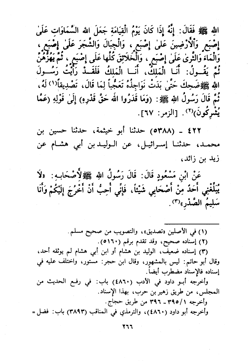 5388 - حَدَّثَنَا أَبُو خَيْثَمَةَ، حَدَّثَنَا حُسَيْنُ بْنُ مُحَمَّدٍ، حَدَّثَنَا إِسْرَائِيلُ، عَنِ الْوَلِيدِ بْنِ أَبِي هِشَامٍ، عَنْ زَيْدِ بْنِ زَائِدٍ، عَنِ ابْنِ مَسْعُودٍ قَالَ: قَالَ رَسُولُ اللَّهِ صَلَّى اللهُ عَلَيْهِ وَسَلَّمَ لِأَصْحَابِهِ: «§لَا يُبَلِّغْنِي أَحَدٌ مِنْ أَصْحَابِي شَيْئًا، فَإِنِّي أُحِبُّ أَنْ أَخْرُجَ إِلَيْكُمْ وَأَنَا سَلِيمُ الصَّدْرِ» Kإسناده ضعيف