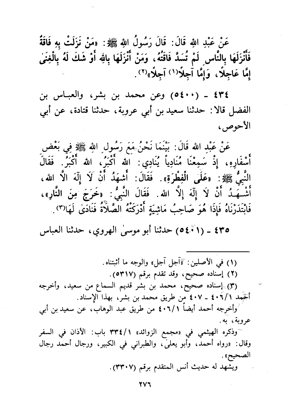 5400 - وَعَنْ مُحَمَّدِ بْنِ بِشْرٍ، وَالْعَبَّاسِ بْنِ الْفَضْلِ قَالَا: حَدَّثَنَا سَعِيدُ بْنُ أَبِي عَرُوبَةَ، حَدَّثَنَا قَتَادَةُ، عَنْ أَبِي الْأَحْوَصِ، عَنْ عَبْدِ اللَّهِ قَالَ: بَيْنَمَا نَحْنُ مَعَ رَسُولِ اللَّهِ صَلَّى اللهُ عَلَيْهِ وَسَلَّمَ فِي بَعْضِ أَسْفَارِهِ إِذْ سَمِعْنَا مُنَادِيًا يُنَادِي: اللَّهُ أَكْبَرُ، اللَّهُ أَكْبَرُ، فَقَالَ النَّبِيُّ صَلَّى اللهُ عَلَيْهِ وَسَلَّمَ: «§عَلَى الْفِطْرَةِ»، فَقَالَ: أَشْهَدُ أَنْ لَا إِلَهَ إِلَّا اللَّهُ، أَشْهَدُ أَنْ لَا إِلَهَ إِلَّا اللَّهُ، فَقَالَ النَّبِيُّ صَلَّى اللهُ عَلَيْهِ وَسَلَّمَ: «خَرَجَ مِنَ النَّارِ»، فَابْتَدَرْنَاهُ، فَإِذَا هُوَ صَاحِبُ مَاشِيَةٍ أَدْرَكَتْهُ الصَّلَاةُ فَنَادَى لَهَاKإسناده صحيح