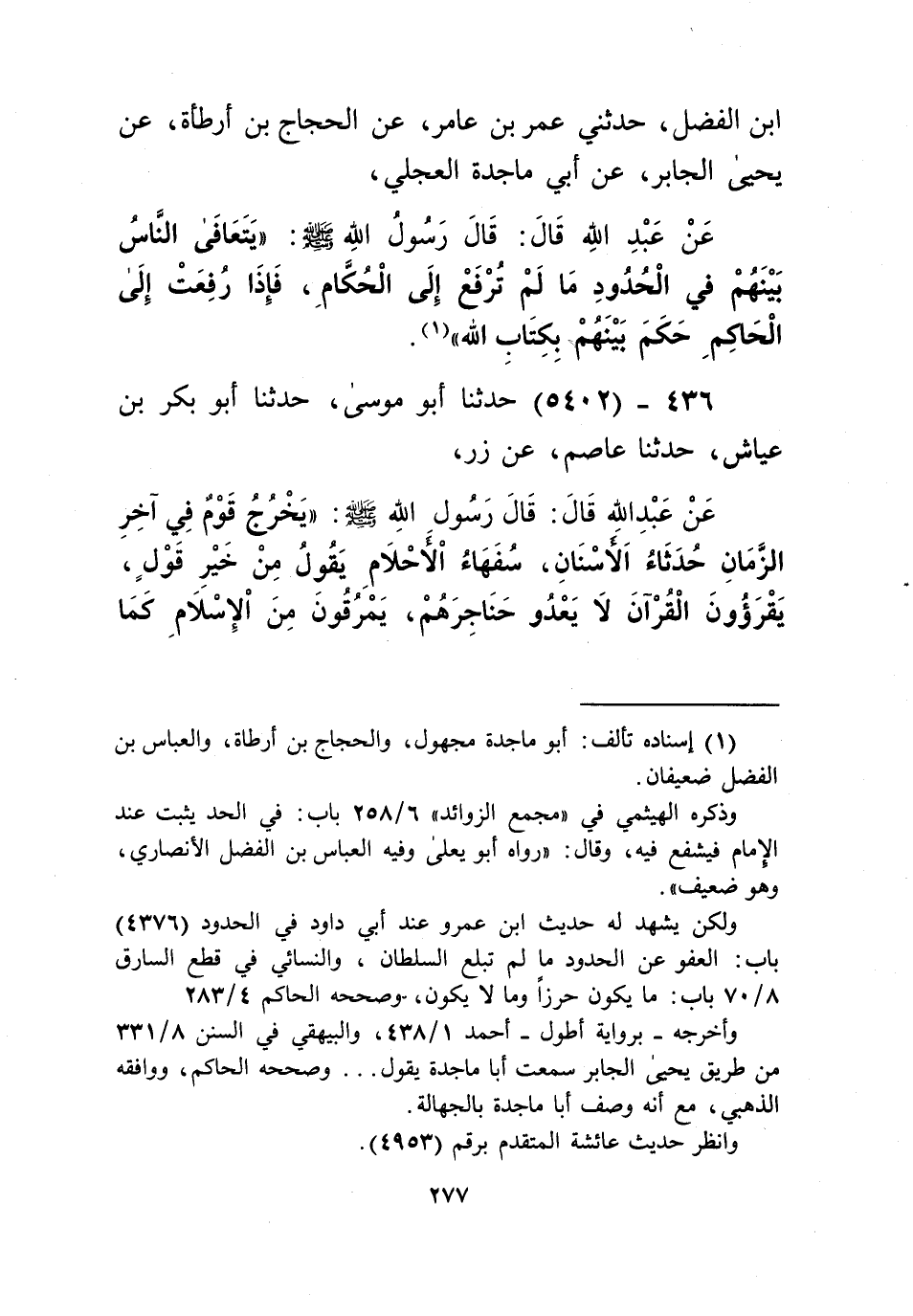 5402 - حَدَّثَنَا أَبُو مُوسَى، حَدَّثَنَا أَبُو بَكْرِ بْنُ عَيَّاشٍ، حَدَّثَنَا عَاصِمٌ، عَنْ زِرٍّ، عَنْ عَبْدِ اللَّهِ قَالَ: قَالَ رَسُولُ اللَّهِ صَلَّى اللهُ عَلَيْهِ وَسَلَّمَ: «§يَخْرُجُ قَوْمٌ فِي آخِرِ الزَّمَانِ حُدَثَاءُ الْأَسْنَانِ، سُفَهَاءُ الْأَحْلَامِ، يَقُولُ مِنْ خَيْرِ قَوْلٍ، يَقْرَءُونَ الْقُرْآنَ لَا يَعْدُو حَنَاجِرَهُمْ، يَمْرُقُونَ مِنَ الْإِسْلَامِ كَمَا يَمْرُقُ السَّهْمُ مِنَ الرَّمِيَّةِ، فَمَنْ لَقِيَهُمْ فَلْيُقَاتِلْهُمْ، فَإِنَّ قَتْلَهُمْ عِنْدَ اللَّهِ أَجْرٌ لِمَنْ قَتَلَهُمْ» Kإسناده حسن