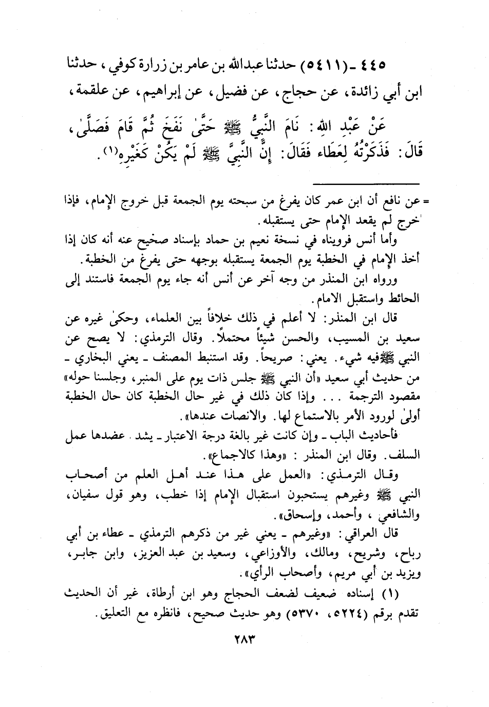 5411 - حَدَّثَنَا عَبْدُ اللَّهِ بْنُ عَامِرِ بْنِ زُرَارَةَ - كُوفِيٌّ -، حَدَّثَنَا ابْنُ أَبِي زَائِدَةَ، عَنْ حَجَّاجٍ، عَنْ فُضَيْلٍ، عَنْ إِبْرَاهِيمَ، عَنْ عَلْقَمَةَ، عَنْ عَبْدِ اللَّهِ، «§نَامَ النَّبِيُّ صَلَّى اللهُ عَلَيْهِ وَسَلَّمَ حَتَّى نَفَخَ ثُمَّ قَامَ فَصَلَّى»، قَالَ: فَذَكَرْتُهُ لِعَطَاءٍ، فَقَالَ: «إِنَّ النَّبِيَّ صَلَّى اللهُ عَلَيْهِ وَسَلَّمَ لَمْ يَكُنْ كَغَيْرِهِ» Kإسناده ضعيف