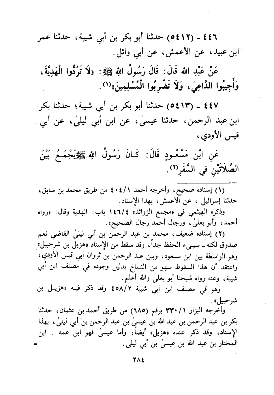 5412 - حَدَّثَنَا أَبُو بَكْرِ بْنُ أَبِي شَيْبَةَ، حَدَّثَنَا عُمَرُ بْنُ عُبَيْدٍ، عَنِ الْأَعْمَشِ، عَنْ أَبِي وَائِلٍ، عَنْ عَبْدِ اللَّهِ قَالَ: قَالَ رَسُولُ اللَّهِ صَلَّى اللهُ عَلَيْهِ وَسَلَّمَ: «§لَا تَرُدُّوا الْهَدِيَّةَ، وَأَجِيبُوا الدَّاعِيَ، وَلَا تَضْرِبُوا الْمُسْلِمِينَ» Kإسناده صحيح