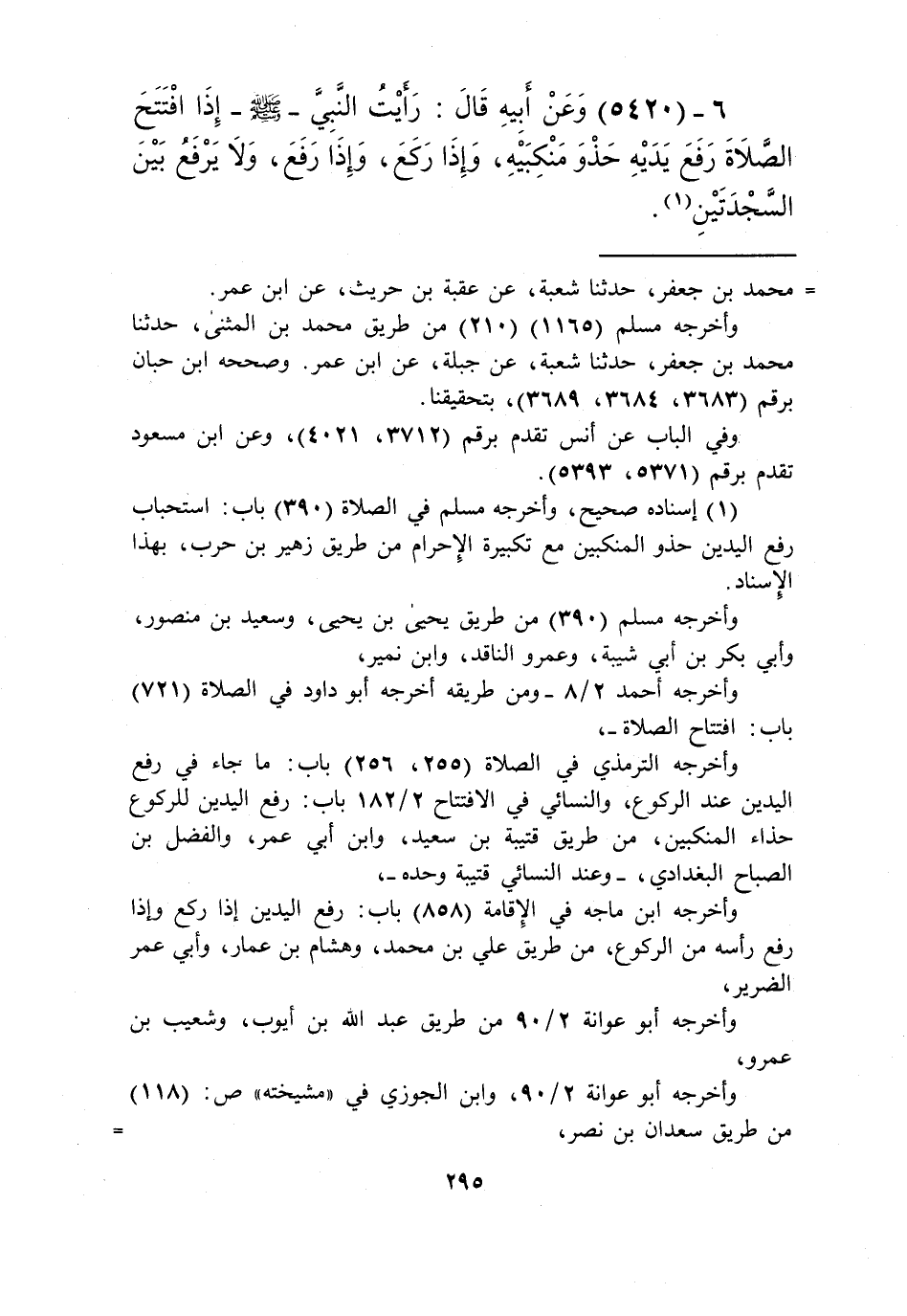 5420 - وَعَنْ أَبِيهِ قَالَ: «رَأَيْتُ النَّبِيَّ صَلَّى اللهُ عَلَيْهِ وَسَلَّمَ §إِذَا افْتَتَحَ الصَّلَاةَ رَفَعَ يَدَيْهِ حَذْوَ مَنْكِبَيْهِ، وَإِذَا رَكَعَ، وَإِذَا رَفَعَ، وَلَا يَرْفَعُ بَيْنَ السَّجْدَتَيْنِ» Kإسناده صحيح