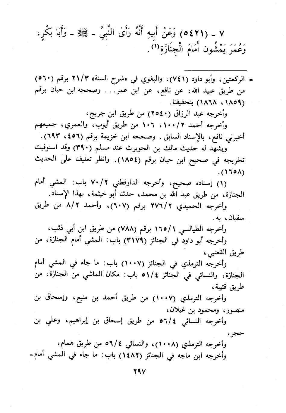 5421 - وَعَنْ أَبِيهِ، «أَنَّهُ رَأَى النَّبِيَّ صَلَّى اللهُ عَلَيْهِ وَسَلَّمَ وَأَبَا بَكْرٍ وَعُمَرَ §يَمْشُونَ أَمَامَ الْجَنَازَةِ» Kإسناده صحيح