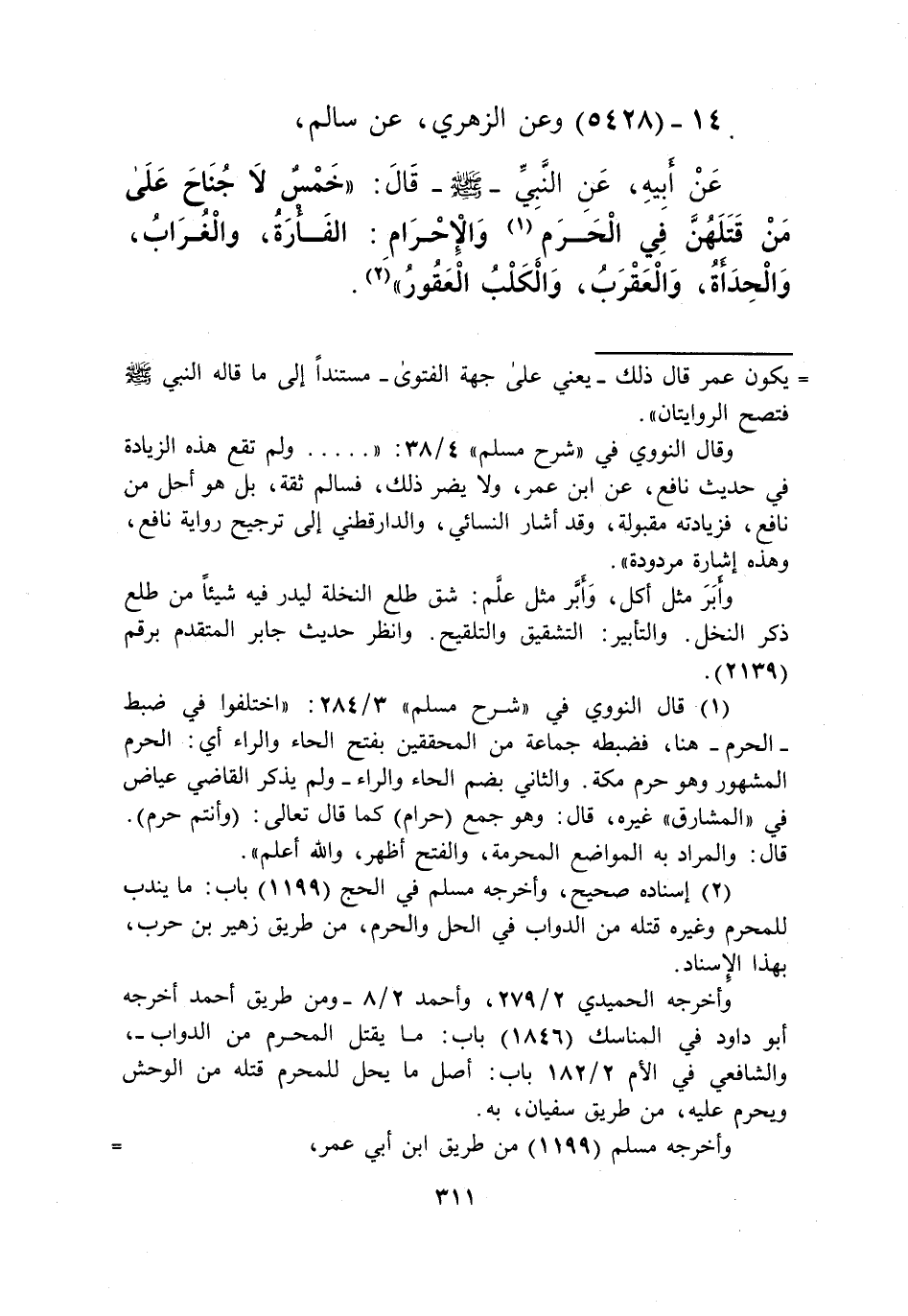 5428 - وَعَنِ الزُّهْرِيِّ، عَنْ سَالِمٍ، عَنْ أَبِيهِ، عَنِ النَّبِيِّ صَلَّى اللهُ عَلَيْهِ وَسَلَّمَ قَالَ: " §خَمْسٌ لَا جُنَاحَ عَلَى مَنْ قَتَلَهُنَّ فِي الْحَرَمِ وَالْإِحْرَامِ: الْفَأْرَةُ، وَالْغُرَابُ، وَالْحِدَأَةُ، وَالْعَقْرَبُ، وَالْكَلْبُ الْعَقُورُ "Kإسناده صحيح