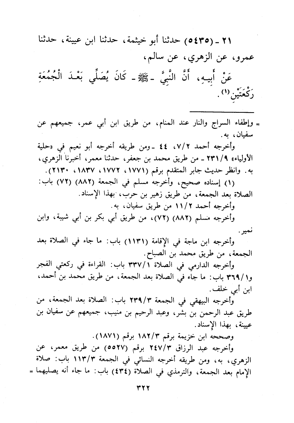 5435 - حَدَّثَنَا أَبُو خَيْثَمَةَ، حَدَّثَنَا ابْنُ عُيَيْنَةَ، حَدَّثَنَا عَمْرٌو، عَنِ الزُّهْرِيِّ، عَنْ سَالِمٍ، عَنْ أَبِيهِ، «أَنَّ النَّبِيِّ صَلَّى اللهُ عَلَيْهِ وَسَلَّمَ كَانَ §يُصَلِّي بَعْدَ الْجُمُعَةِ رَكْعَتَيْنِ» Kإسناده صحيح