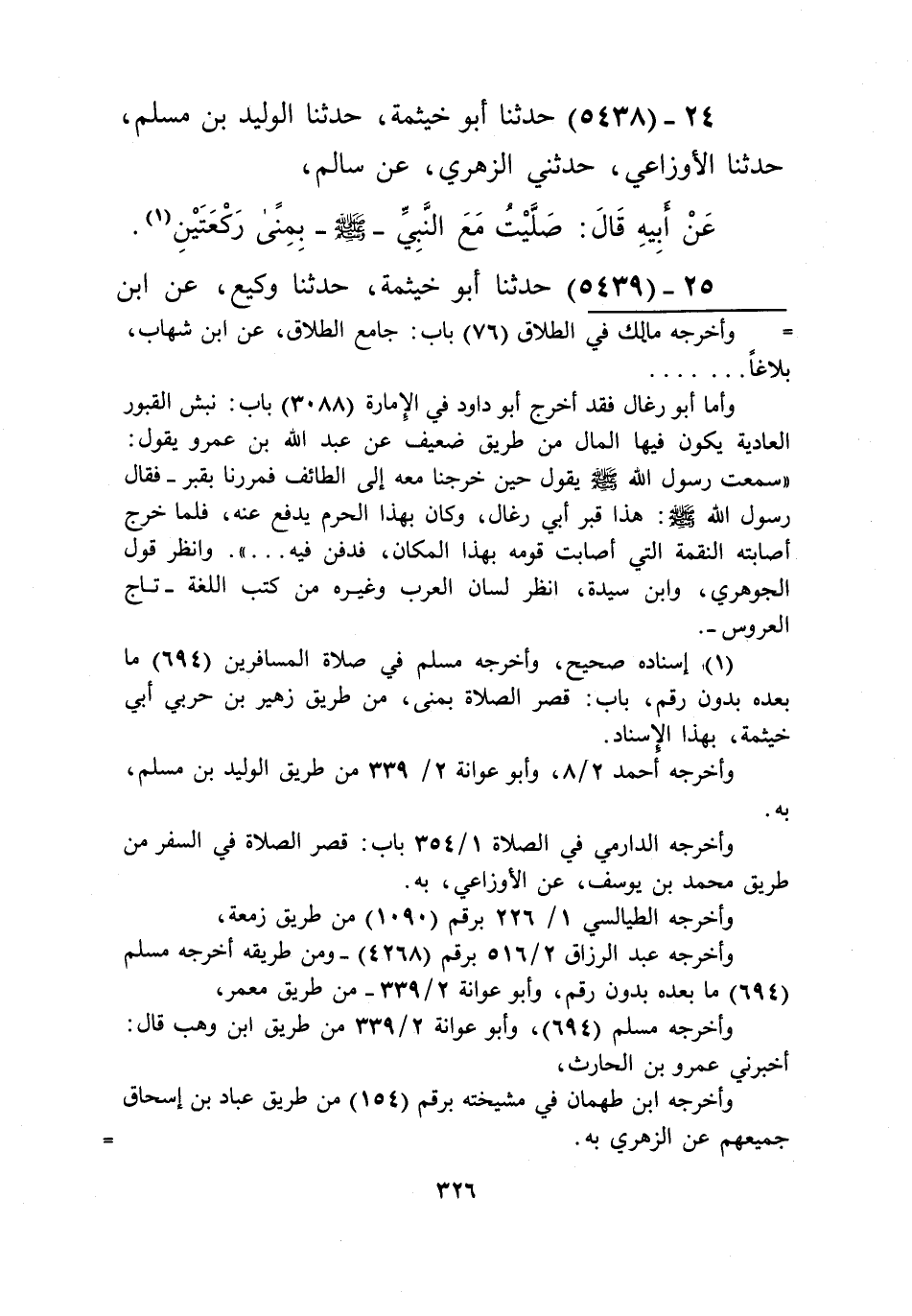 5438 - حَدَّثَنَا أَبُو خَيْثَمَةَ، حَدَّثَنَا الْوَلِيدُ بْنُ مُسْلِمٍ، حَدَّثَنَا الْأَوْزَاعِيُّ، حَدَّثَنِي الزُّهْرِيُّ، عَنْ سَالِمٍ، عَنْ أَبِيهِ قَالَ: «§صَلَّيْتُ مَعَ النَّبِيِّ صَلَّى اللهُ عَلَيْهِ وَسَلَّمَ بِمِنًى رَكْعَتَيْنِ» Kإسناده صحيح