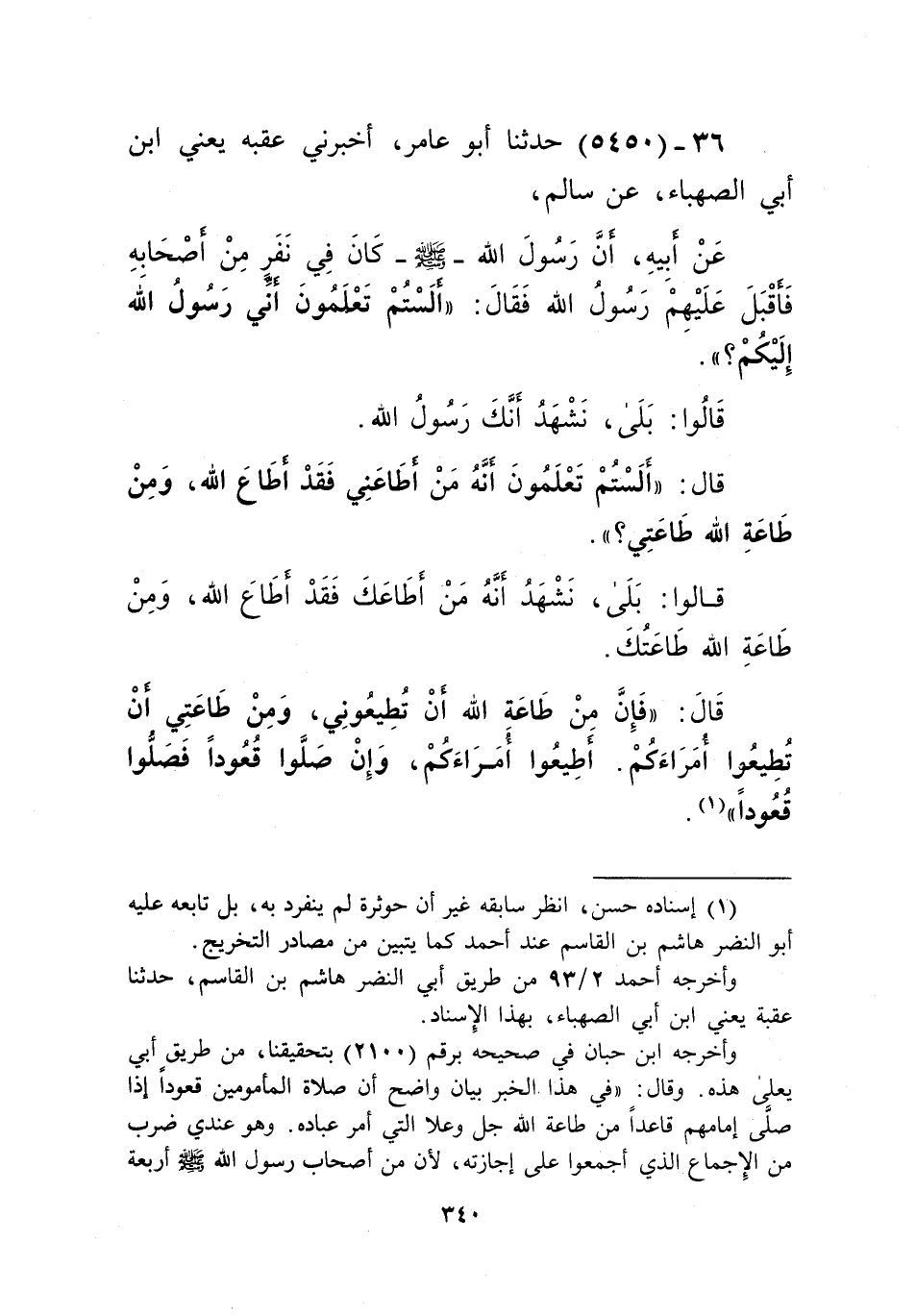5450 - حَدَّثَنَا أَبُو عَامِرٍ، أَخْبَرَنِي عُقْبَةُ , يَعْنِي ابْنَ أَبِي الصَّهْبَاءِ، عَنْ سَالِمٍ، عَنْ أَبِيهِ، أَنَّ رَسُولَ اللَّهِ صَلَّى اللهُ عَلَيْهِ وَسَلَّمَ كَانَ فِي نَفَرٍ مِنْ أَصْحَابَهِ، فَأَقْبَلَ عَلَيْهِمْ رَسُولُ اللَّهِ صَلَّى اللهُ عَلَيْهِ وَسَلَّمَ فَقَالَ: «أَلَسْتُمْ تَعْلَمُونَ أَنِّي رَسُولُ اللَّهِ إِلَيْكُمْ؟»، قَالُوا: بَلَى، نَشْهَدُ أَنَّكَ رَسُولُ اللَّهِ، قَالَ: «أَلَسْتُمْ تَعْلَمُونَ أَنَّهُ مَنْ أَطَاعَنِي فَقَدْ أَطَاعَ اللَّهَ، وَمِنْ طَاعَةِ اللَّهِ طَاعَتِي؟»، قَالُوا: بَلَى، نَشْهَدُ أَنَّهُ مَنْ أَطَاعَكَ فَقَدْ أَطَاعَ اللَّهَ، وَمِنْ طَاعَةِ اللَّهِ طَاعَتُكَ، قَالَ: «فَإِنَّ §مِنْ طَاعَةِ اللَّهِ أَنْ تُطِيعُونِي، وَمِنْ طَاعَتِي أَنْ تُطِيعُوا أُمَرَاءَكُمْ، أَطِيعُوا أُمَرَاءَكُمْ، وَإِنْ صَلَّوْا قُعُودًا فَصَلُّوا قُعُودًا» Kإسناده حسن